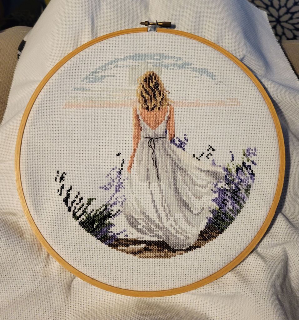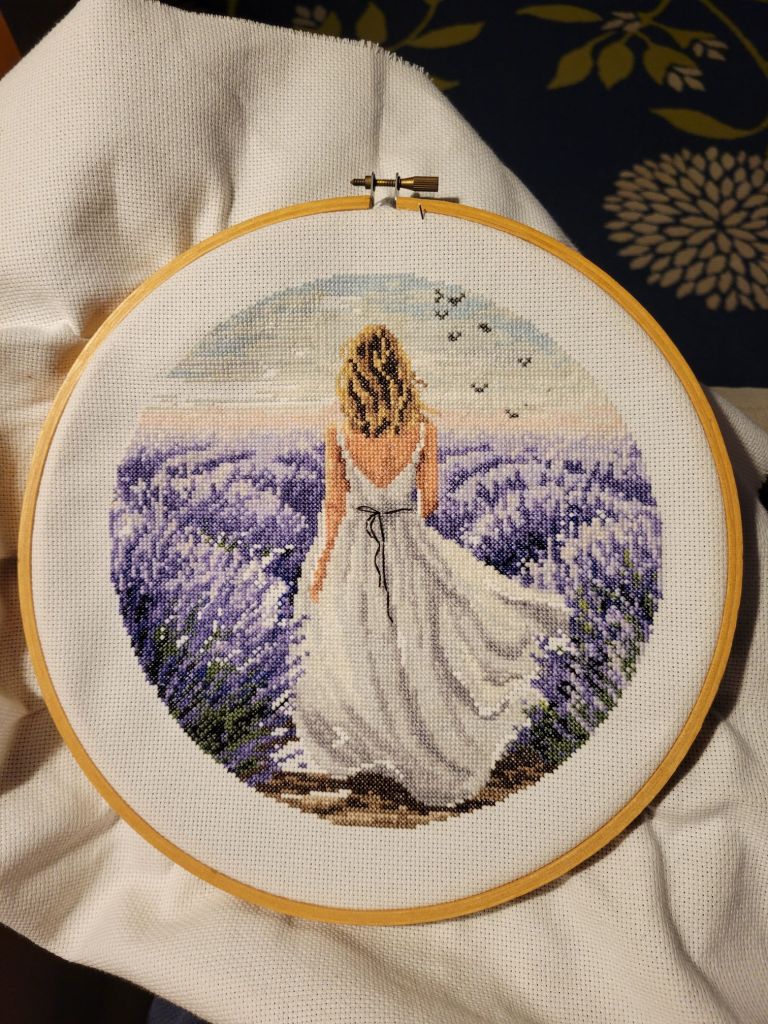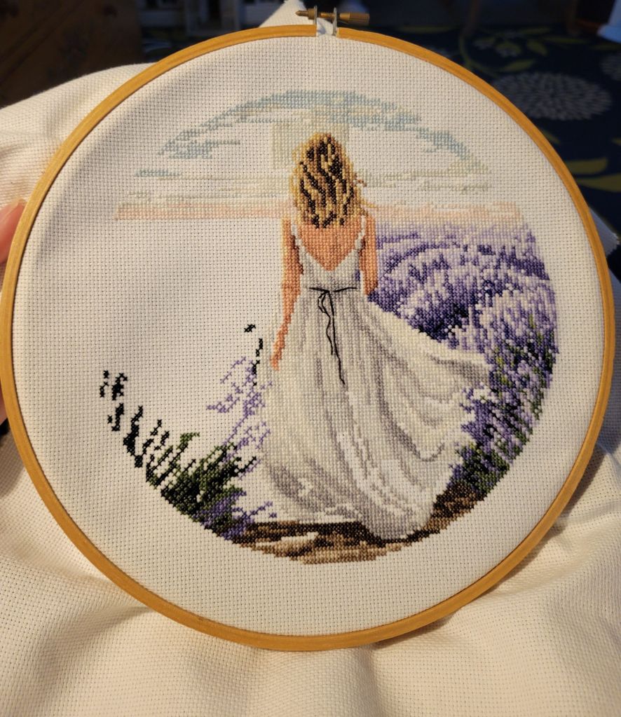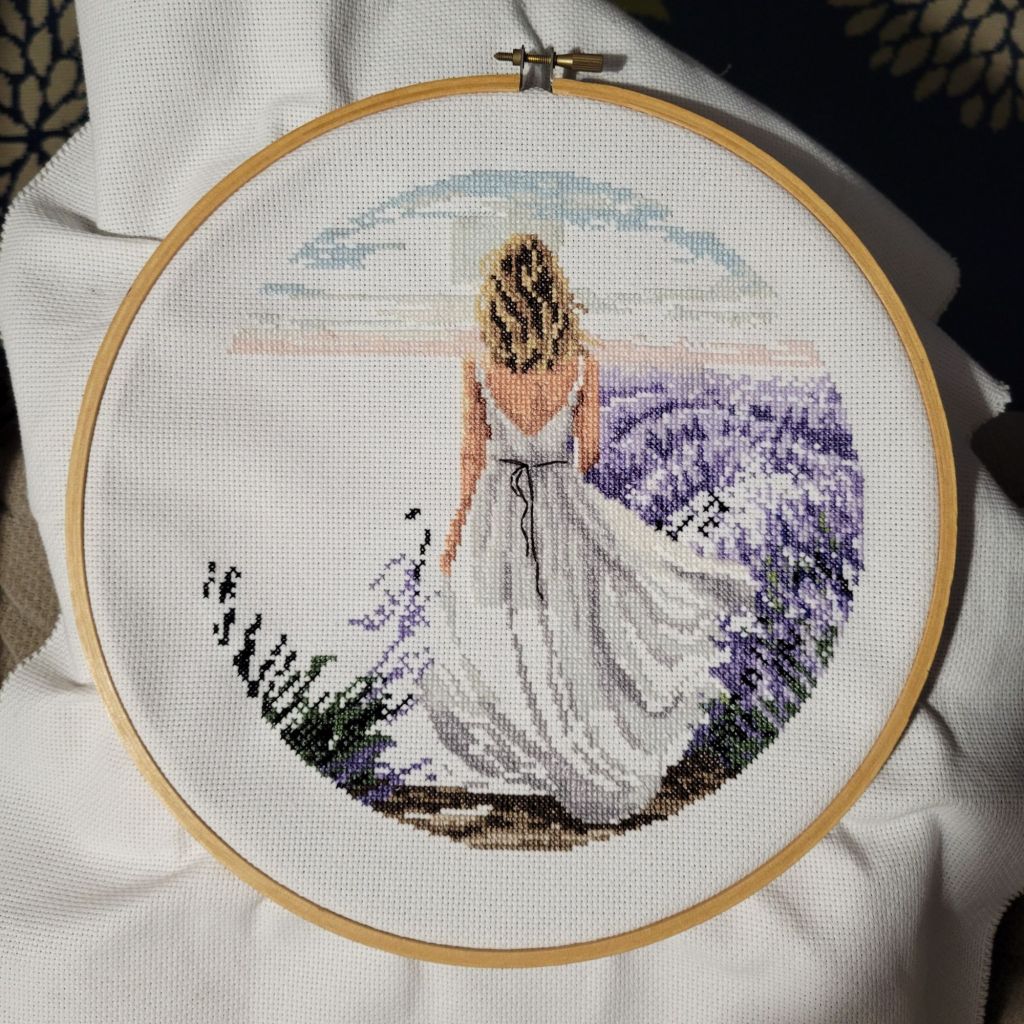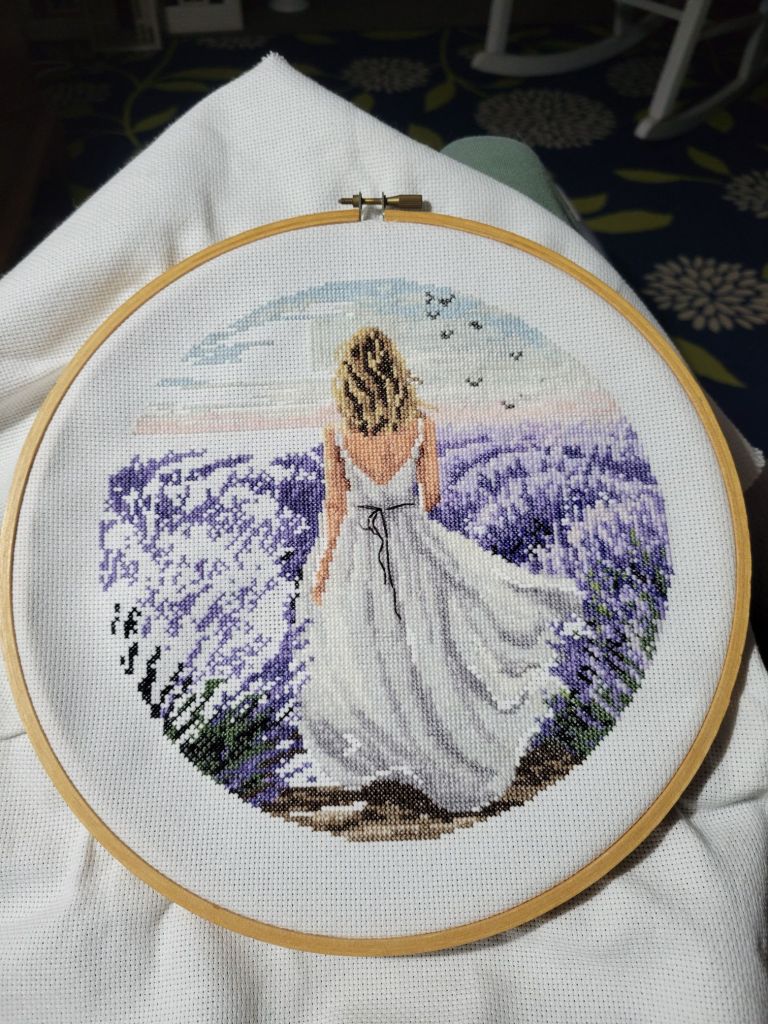 I got a ton more stitched on Lavendar Girl.
