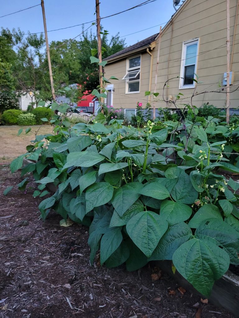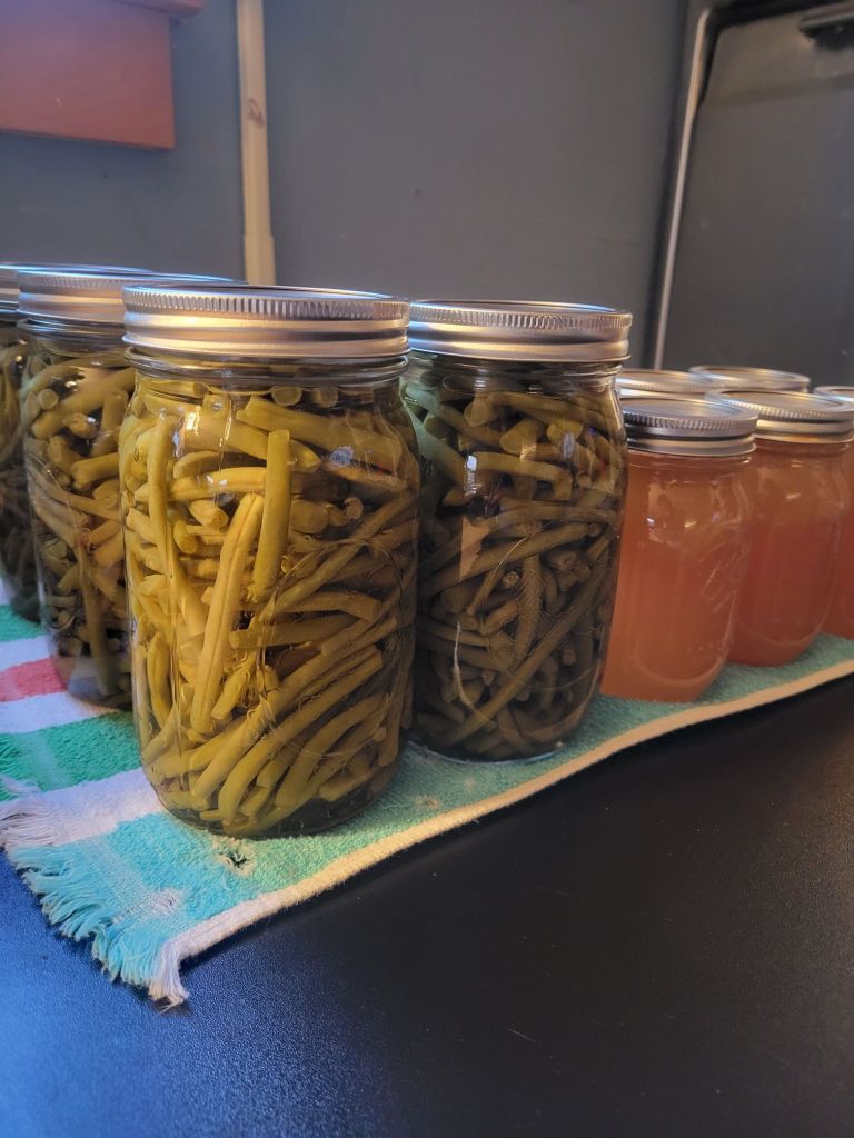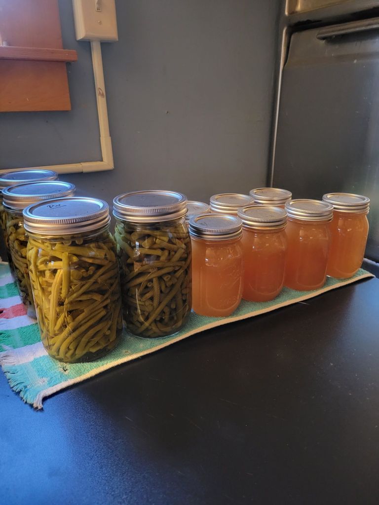 When I got home, I got 4 quarts of beans in the pressure canner, which I had prepped for before I went to the meeting. After those were done and waiting to come out of the canner, I got 7 pints of the peach syrup in the water bath canner. In between all of this, I got 6 bunches of herbs hung up to dry and had Dancing with the Stars on in the background.