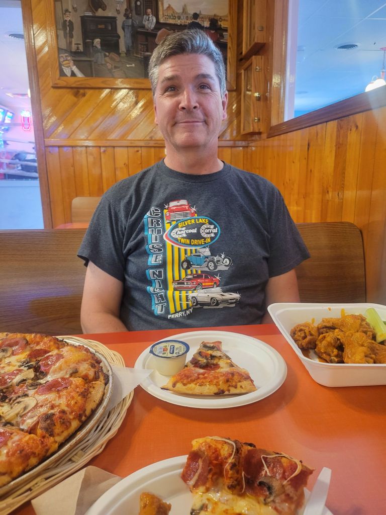 After such an aggravating day, we took the ’57 over to the Charcoal Corral about 25 minutes from us and had dinner. The Corral is a local treasure with two drive-in movie screens, mini golf, fine dining, pizza, ice cream, and arcade. We know the owner and he sat and chatted with us until we got our food.