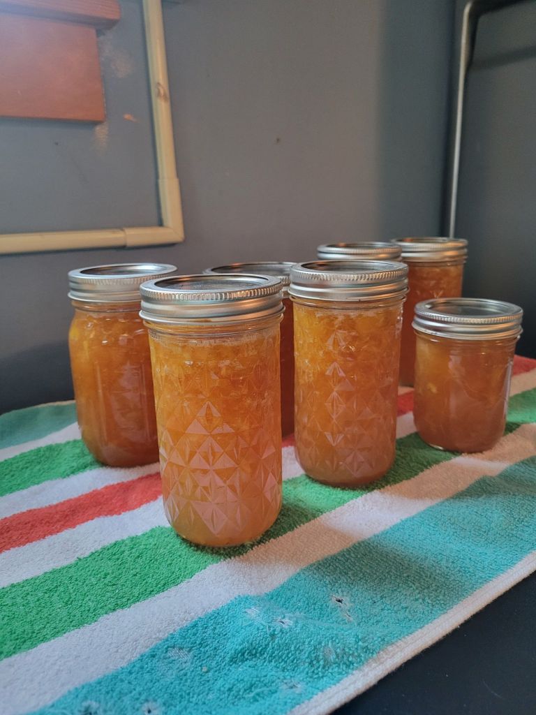 I got to work after dinner, getting two batches of peach jam made, and after cleaning that all up, I got two half sheets baked for the weekend’s orders.