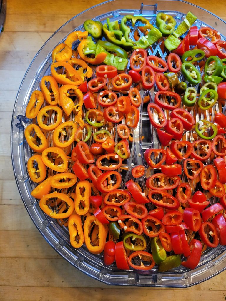 Then I dehydrated rings of lunchbox peppers. I have done this in years past and then run them through a coffee grinder to make powder, but I elected to dry and store them just as they were to use in soups and stews and sauces later. I like both methods. We ate the rest of the haul, fresh.