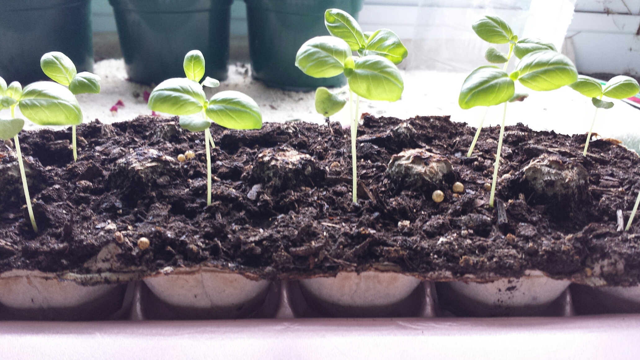 My pop bottle experiment has gone fabulously! I have replanted all 24 tiny basil seedlings into their own individual space using two biodegradable cardboard egg cartons. Free and easy container space which of course I love.