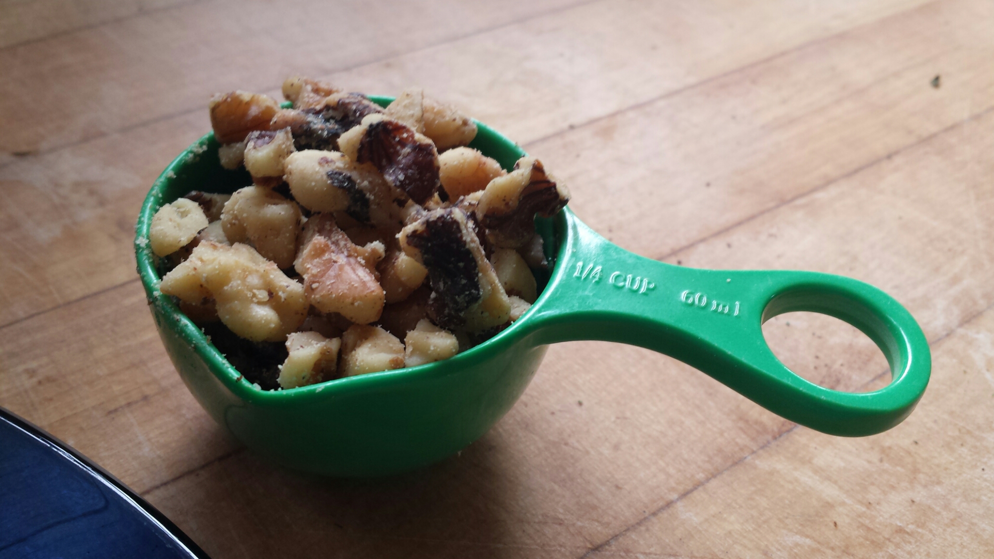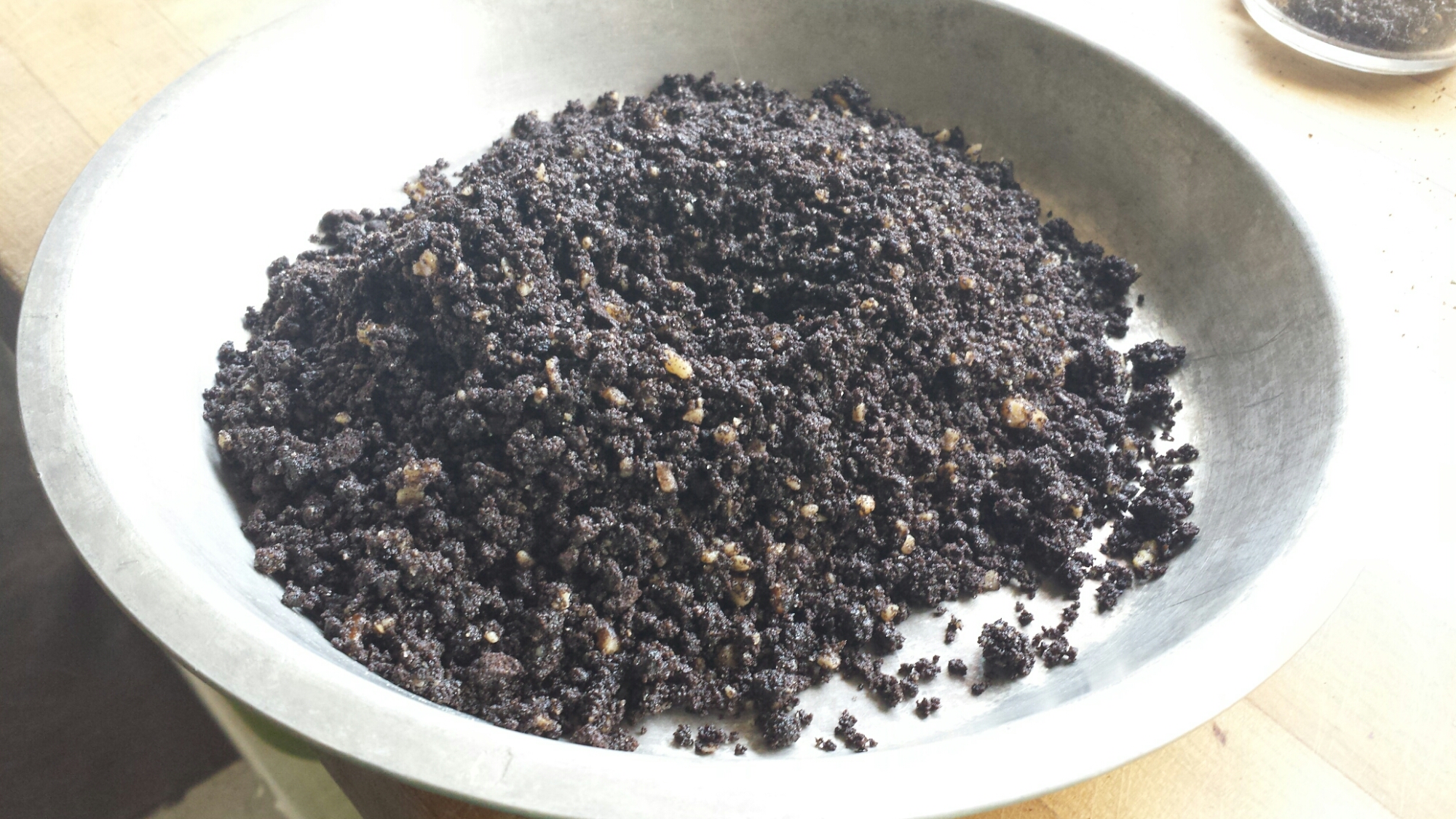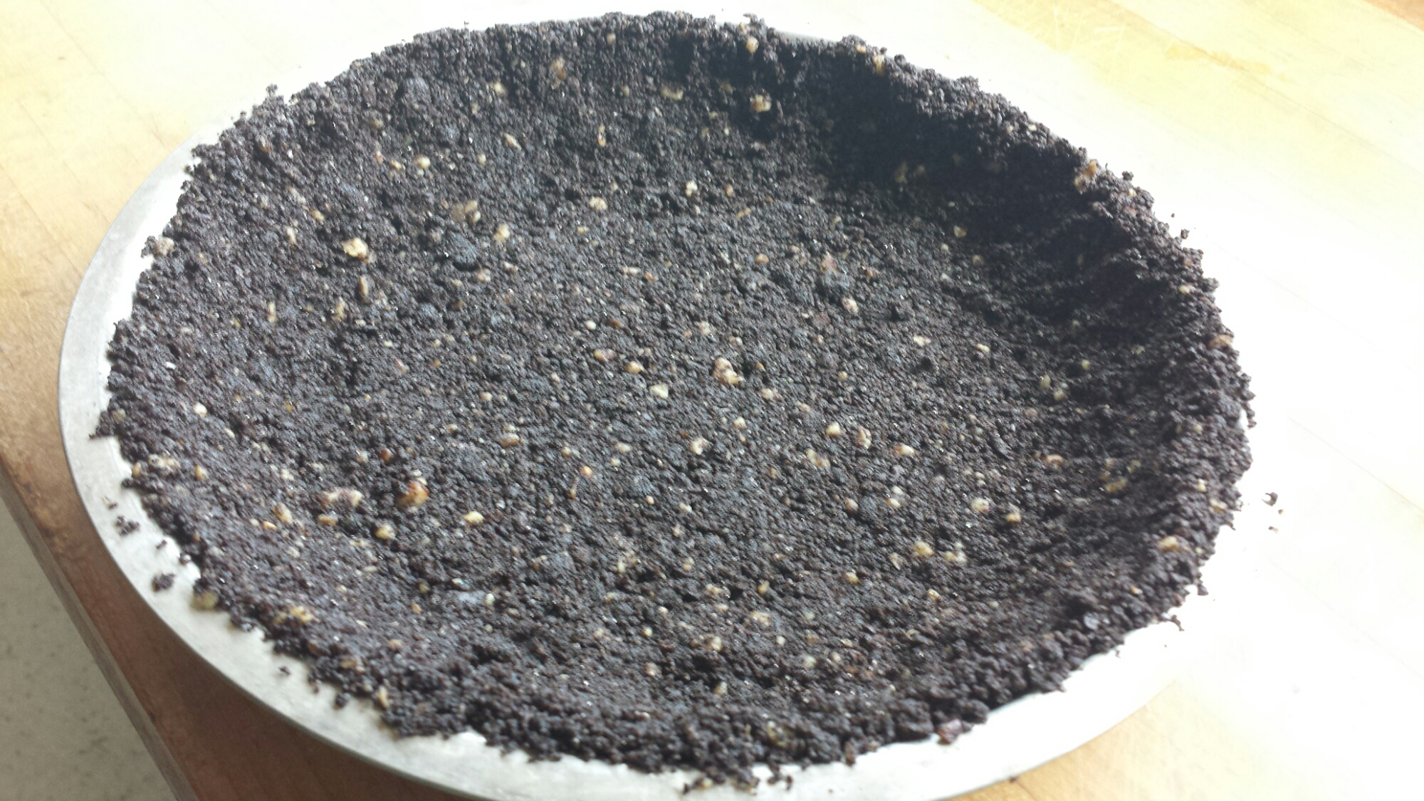 Start with 18 Oreo cookies, fillings removed. Grind along with a 1/4 cup of chopped pecans and 1 Tbsp of sugar in a food processor or mini-chopper.