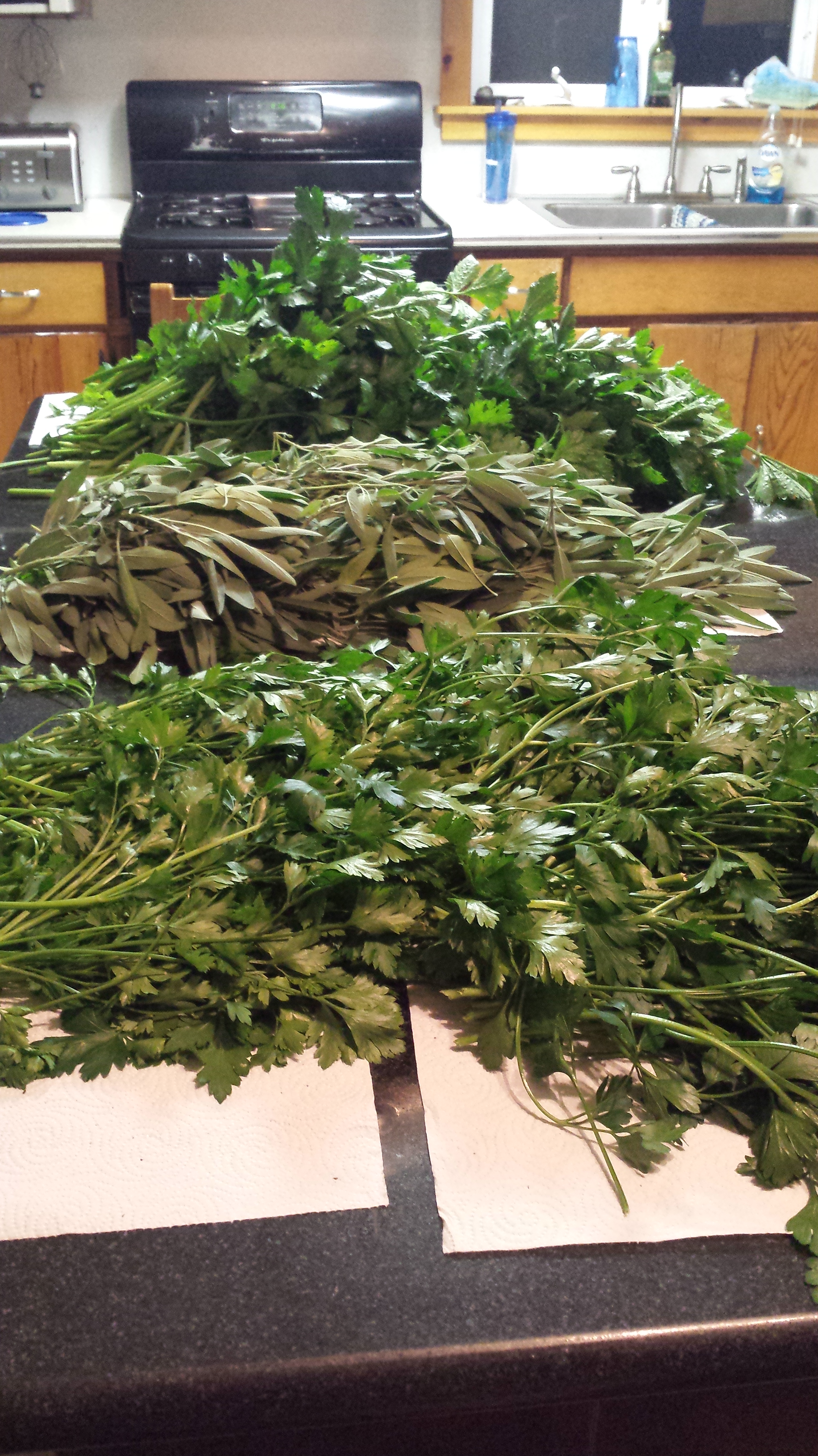 Take a look at my 6 foot island covered in what I cut. Keep in mind the amount of sage I cut was from one single plant and the celery and parsley were from only 6 plants. Wow huh?!