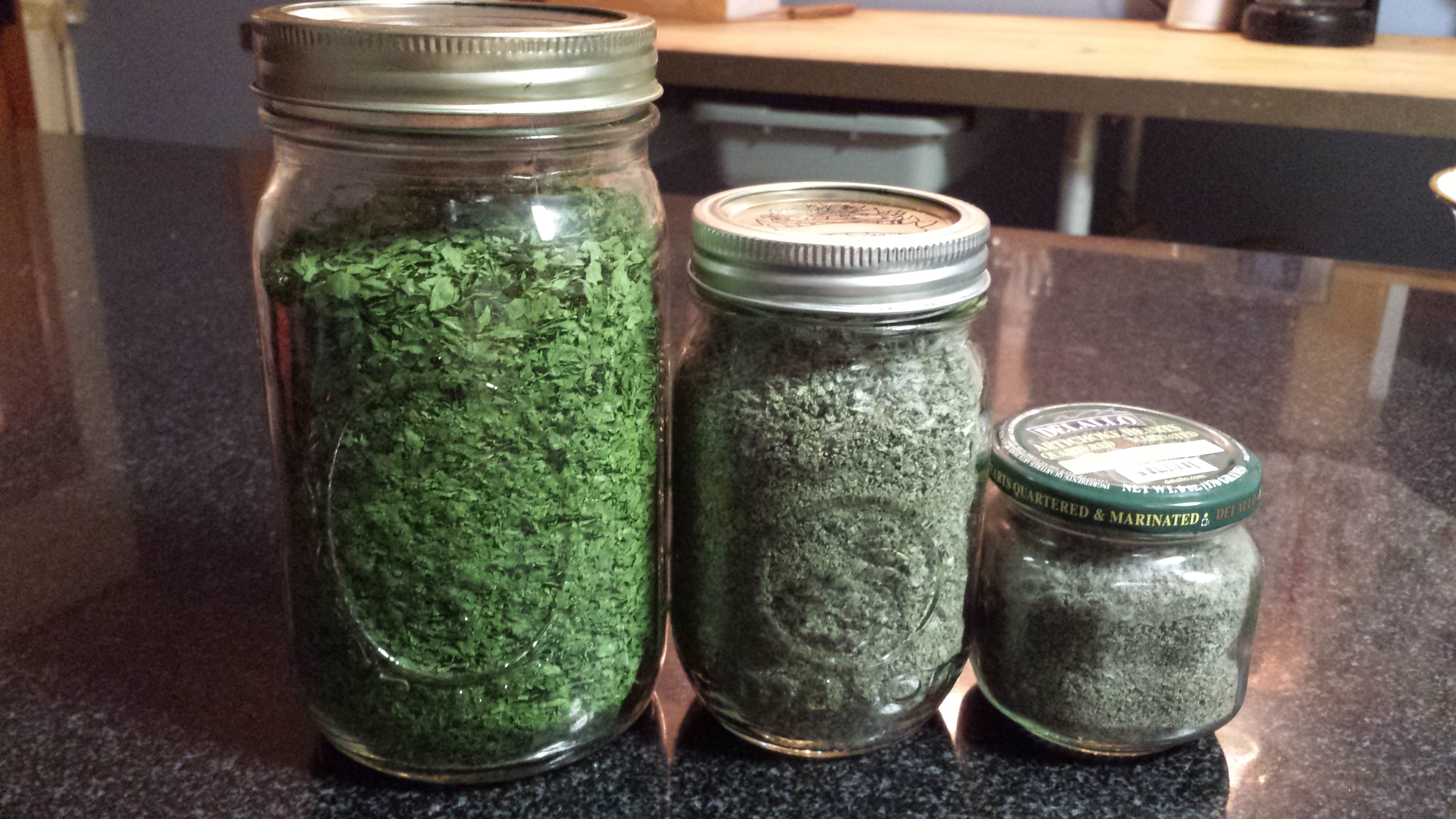 After the drying process in my dehydrators I ran all of the dried leaves through my mini chopper and got an entire quart of parsley and more than a pint of sage. I still haven’t finished the celery.