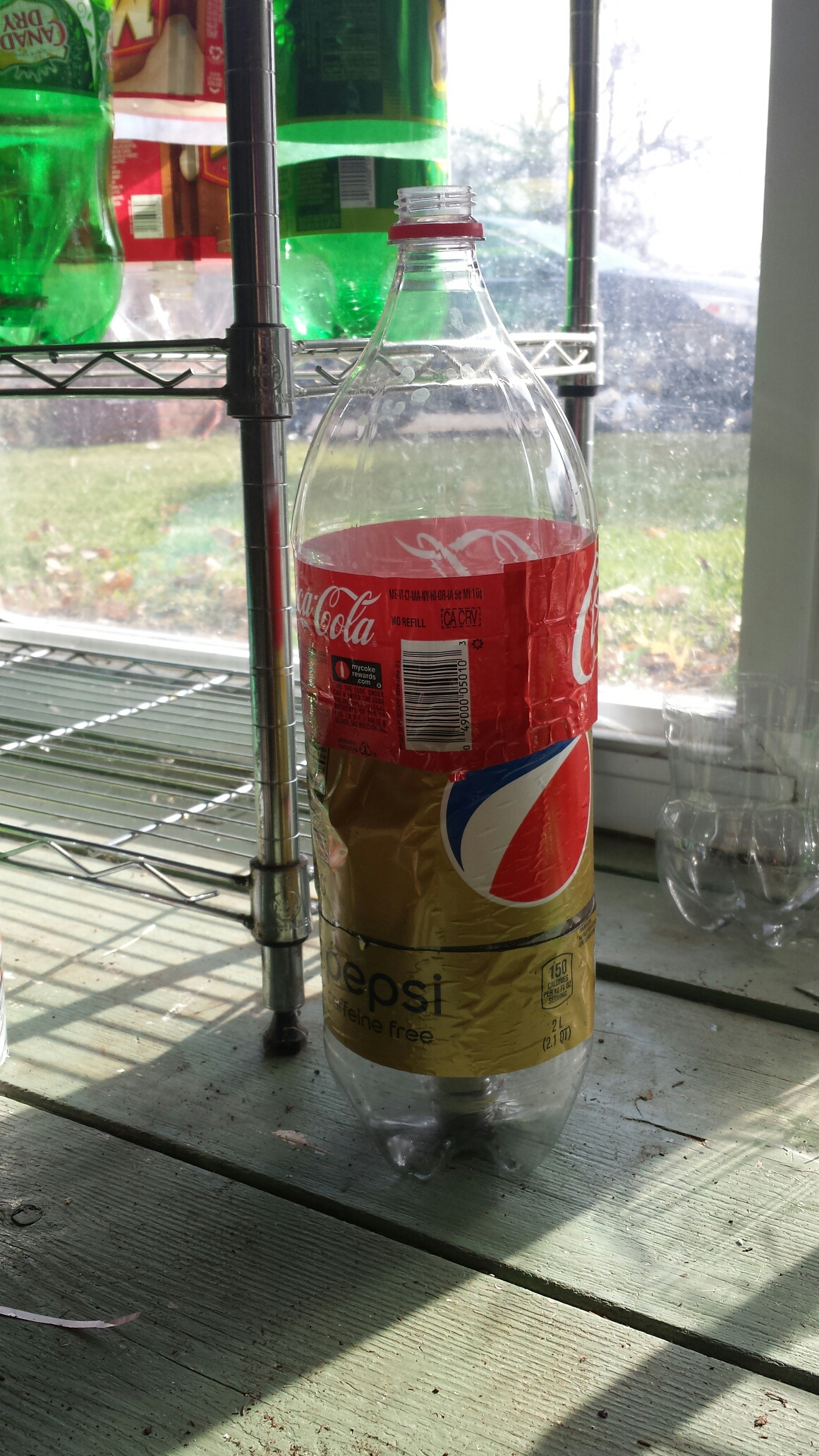 Cut two clean 2 liter pop bottles in half with a sharp knife by poking the tip of the knife into the sides of one of the bottles and slicing around the side of it until it is in two pieces.