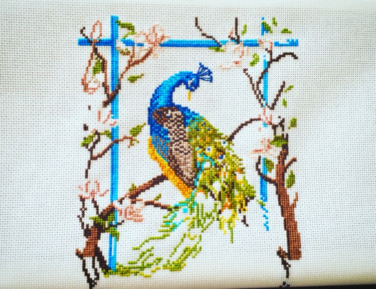 My last post on my peacock cross-stitch project was on weeks 1-3. This photo is week 4. It may seem like I am almost done but the entire plume on Miss Peacock has yet to be worked on. Wait until you see how big it is. Yikes! That will take me a while especially with spring gardening in my future.