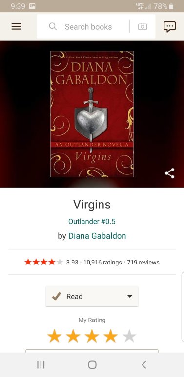 Virgins is an Outlander Novella which was kind of fun to read. If you are an Outlander fan it tells the story between the time Jamie was so severely flogged and when he met Claire gor the first time. It was pretty good. Nice short read!