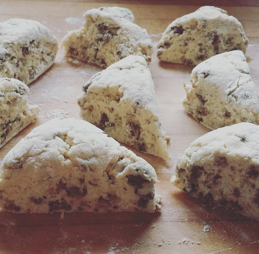 Scones: Blueberry, Cinnamon Apple, chocolate chip, walnut, sausage, or Plain Cinnamon scones (great for strawberry Shortcake) 6 for $8 or $1.50 ea.