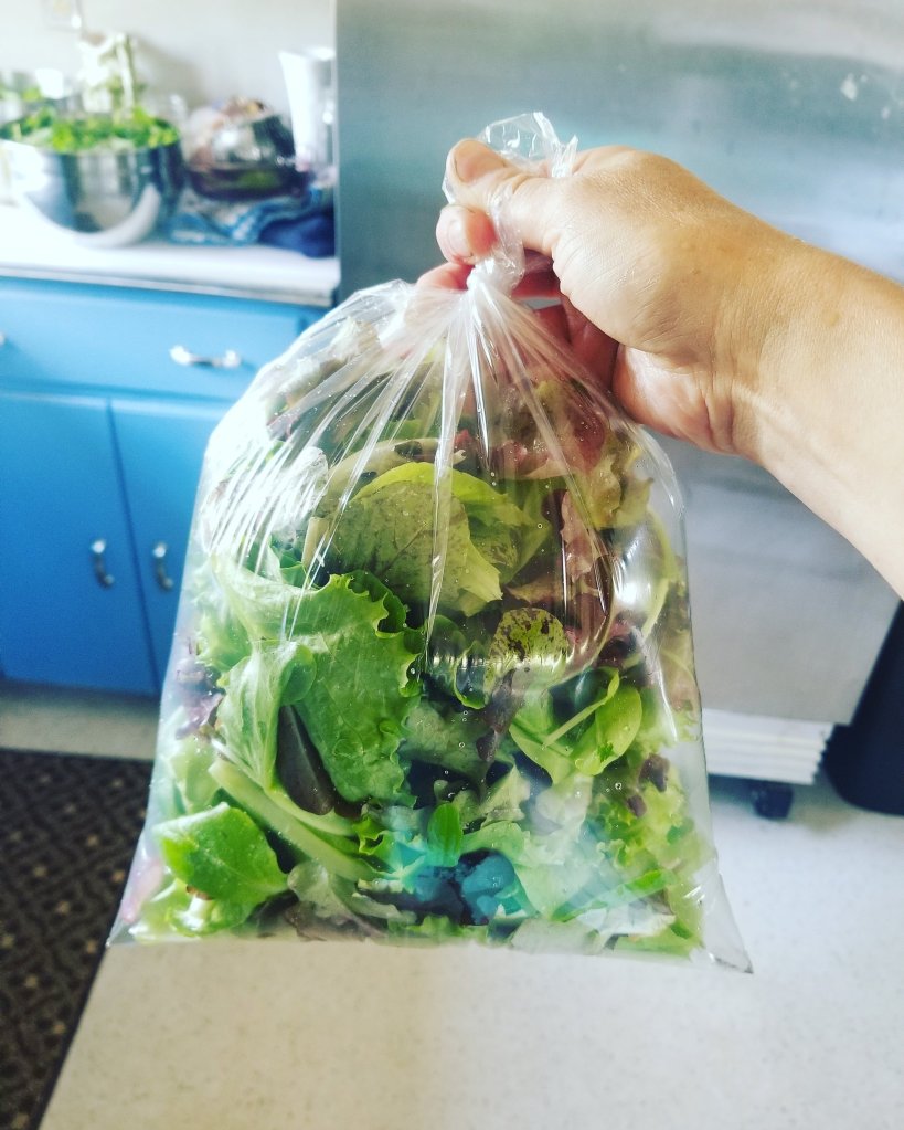 I will have 4 bags of mixed green lettuce ready again this week. First come first served. My mom yelled at me for only charging $2.50 last time so I have upped them to $3.50 for a 12 oz bag lol!