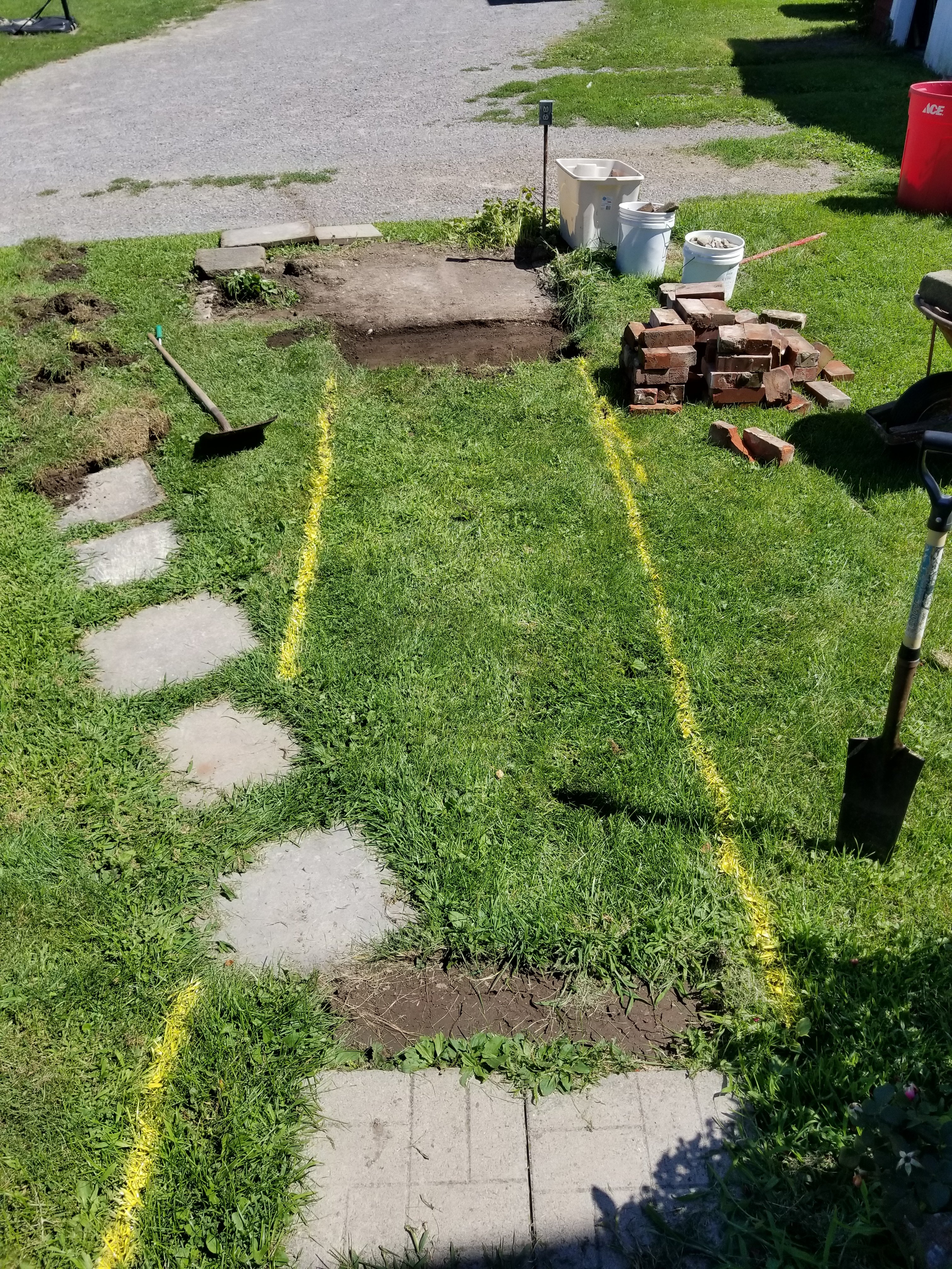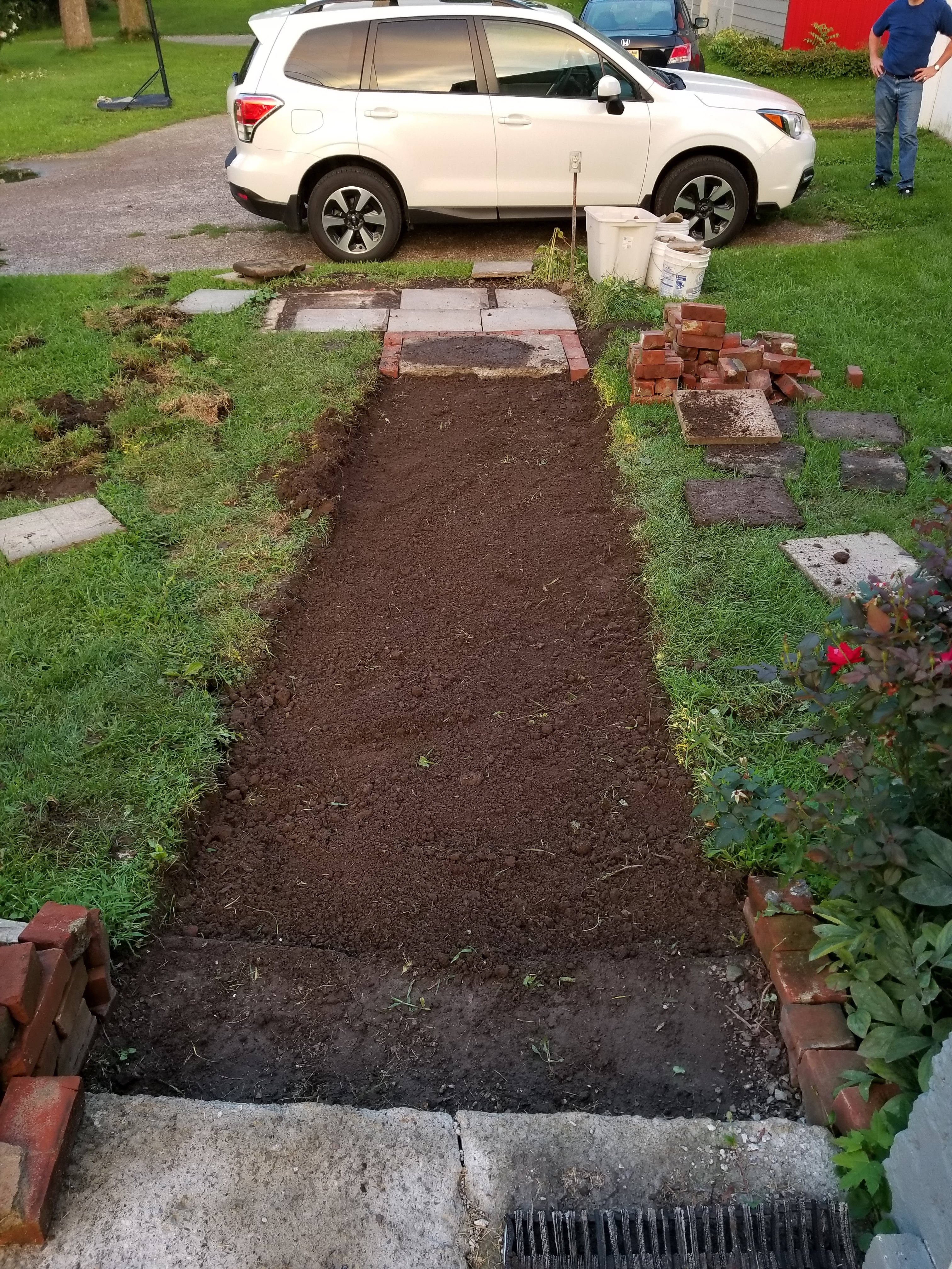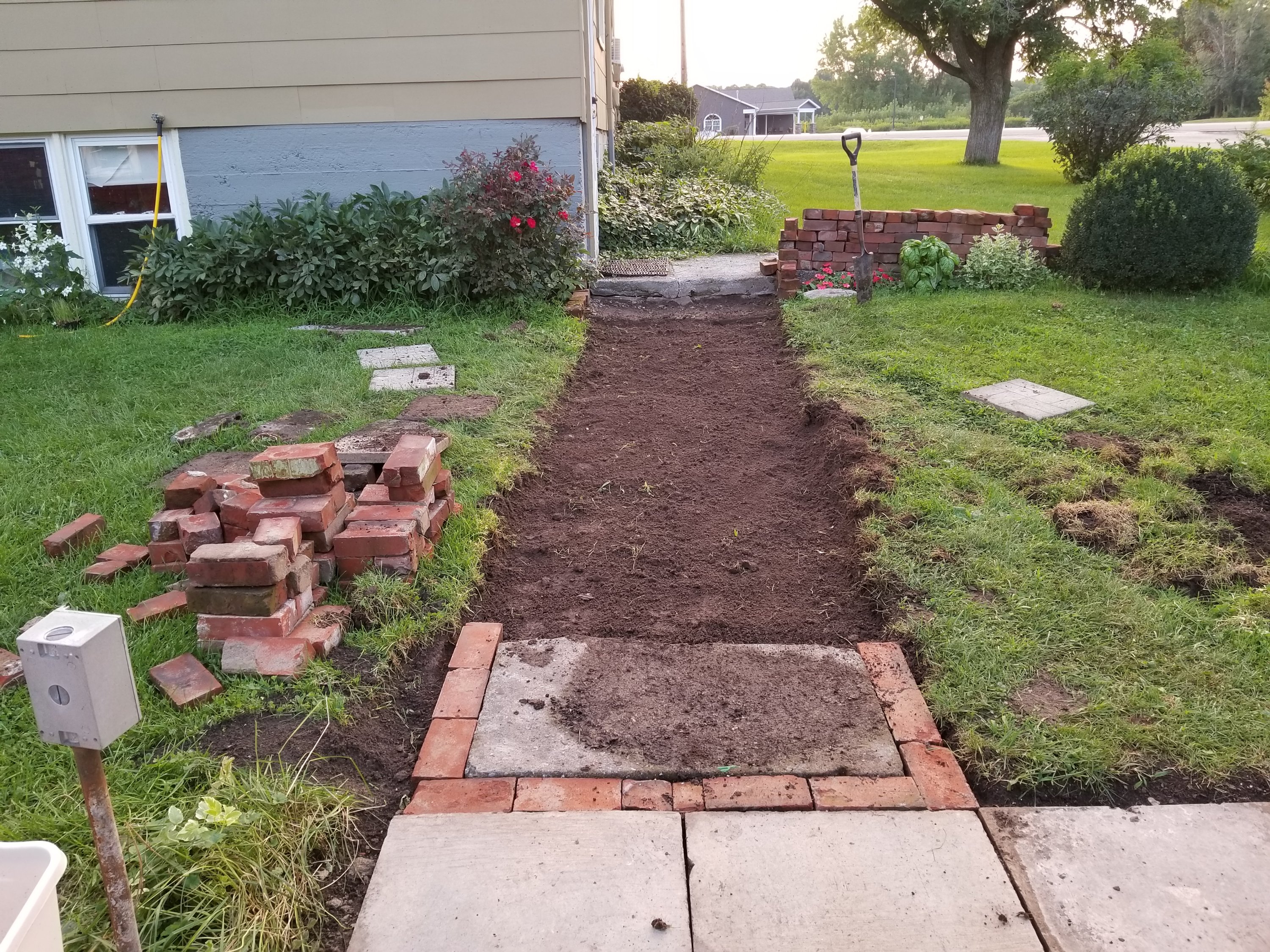 We know that technically we should have put a base of sand or underlayment down before we placed the stones and bricks, but we wanted this project to be a no cost solution to our walkway problem, so if it sinks a bit for now we are ok with it. When we have more cash for projects like this we will definitely have a professional do it.