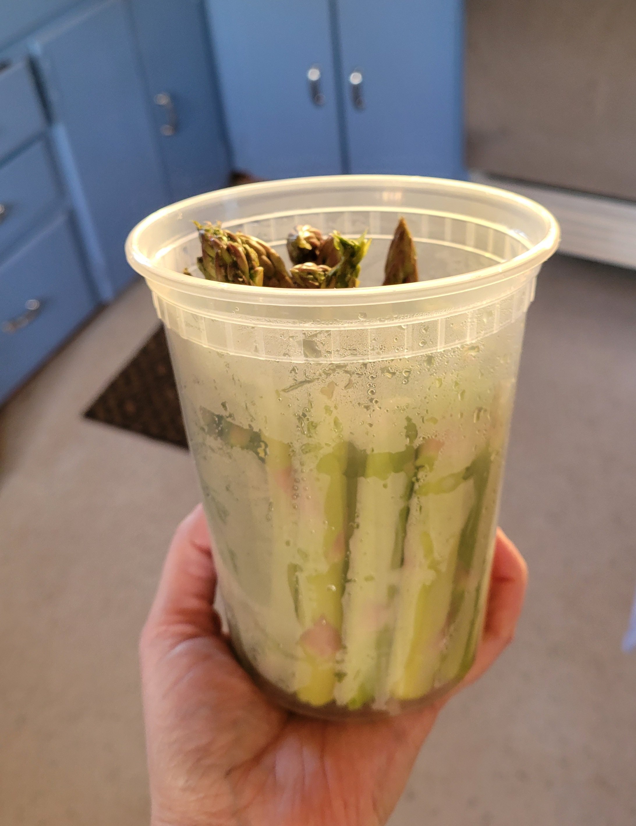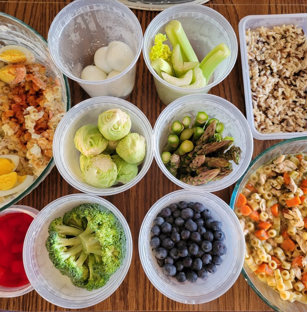 I finished a chicken soup I had started, made a mac salad, boiled and peeled a dozen eggs to have in the fridge for salad and breakfast, made J-ello with fruit, cooked a batch of wild and brown rice for side meals, then I prepped a whole bunch of veggies for easy steaming. Asparagus, broccoli, Brussels sprouts, and celery for soups. We had three different containers of blueberries in the fridge so I sorted all of those and got them washed for topping oatmeal and such.