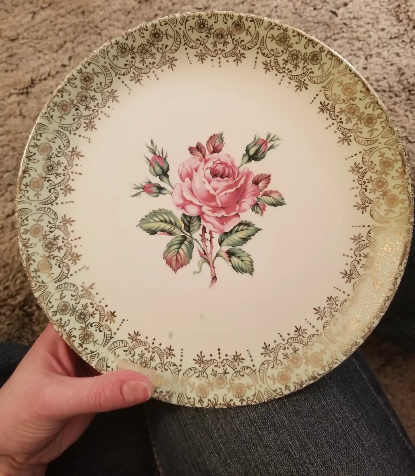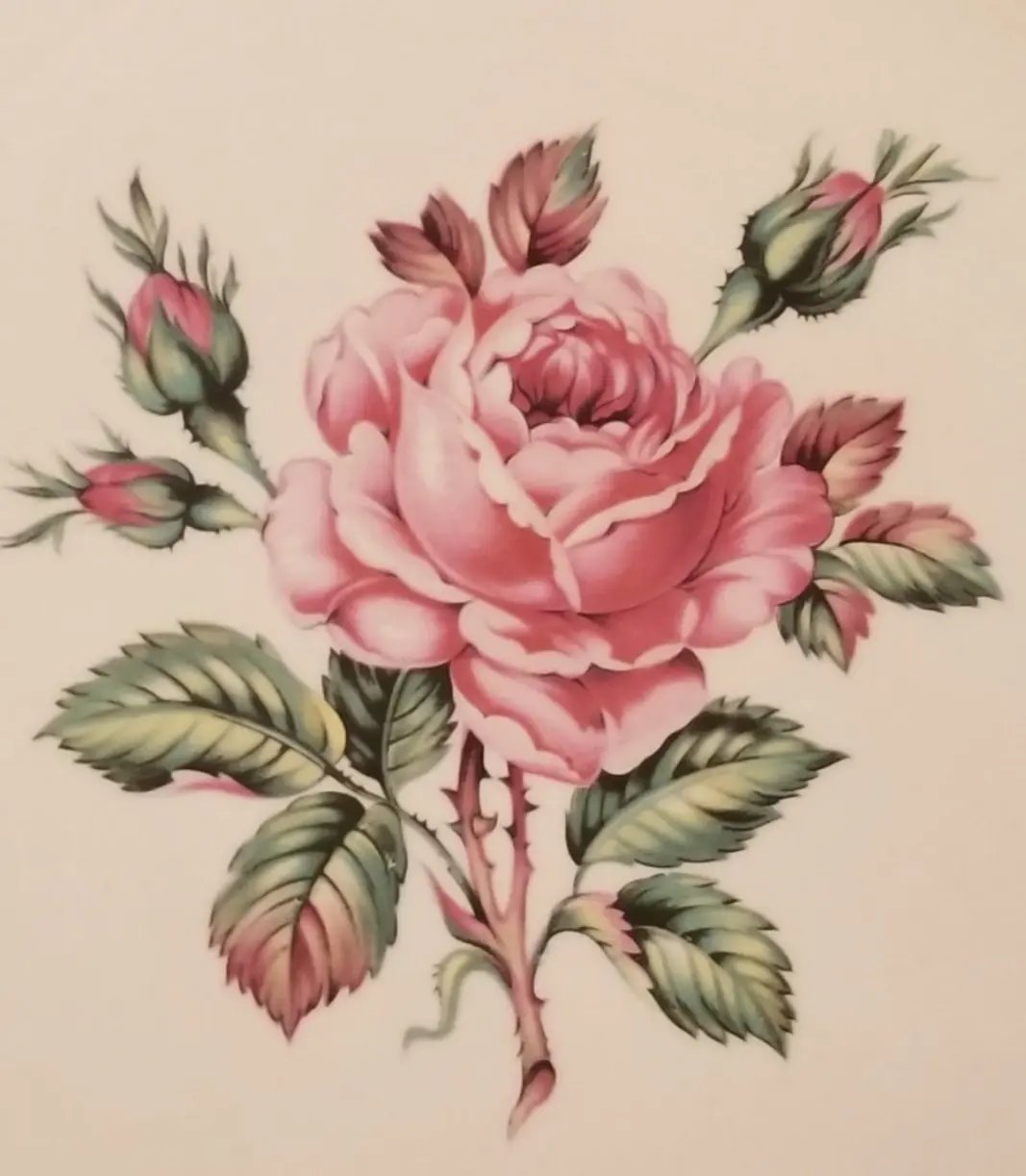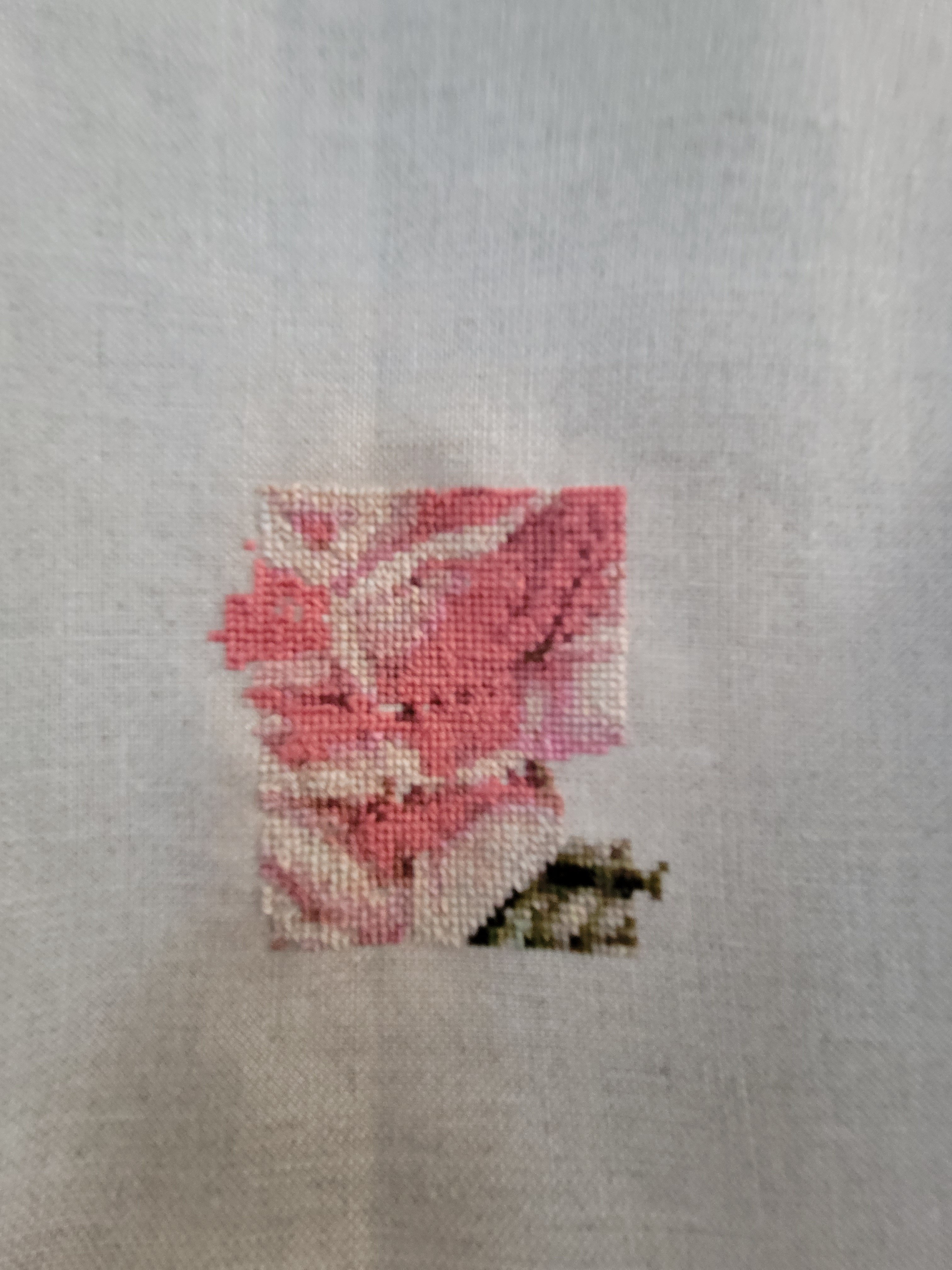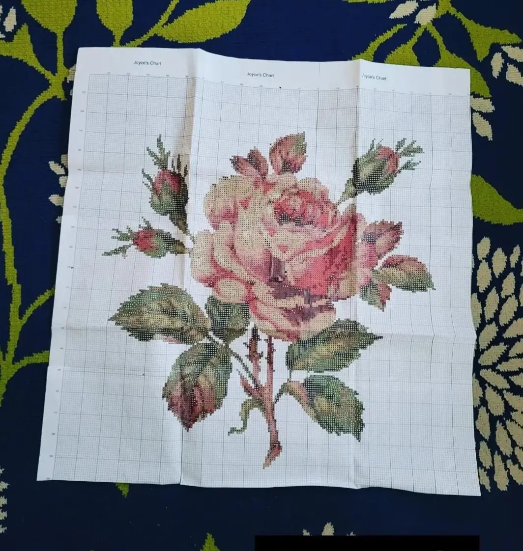I was poking around in my mom-in-law’s china cabinet one day and I found the dishes she used for special occasions. It’s an older pattern from the 60s but it has such a clear, distinct rose design. I photographed it and scanned the photo into my WinStitch pattern maker PC program. After a few adjustments and removal of any background color I had a very big and very stitchable pattern to work from.