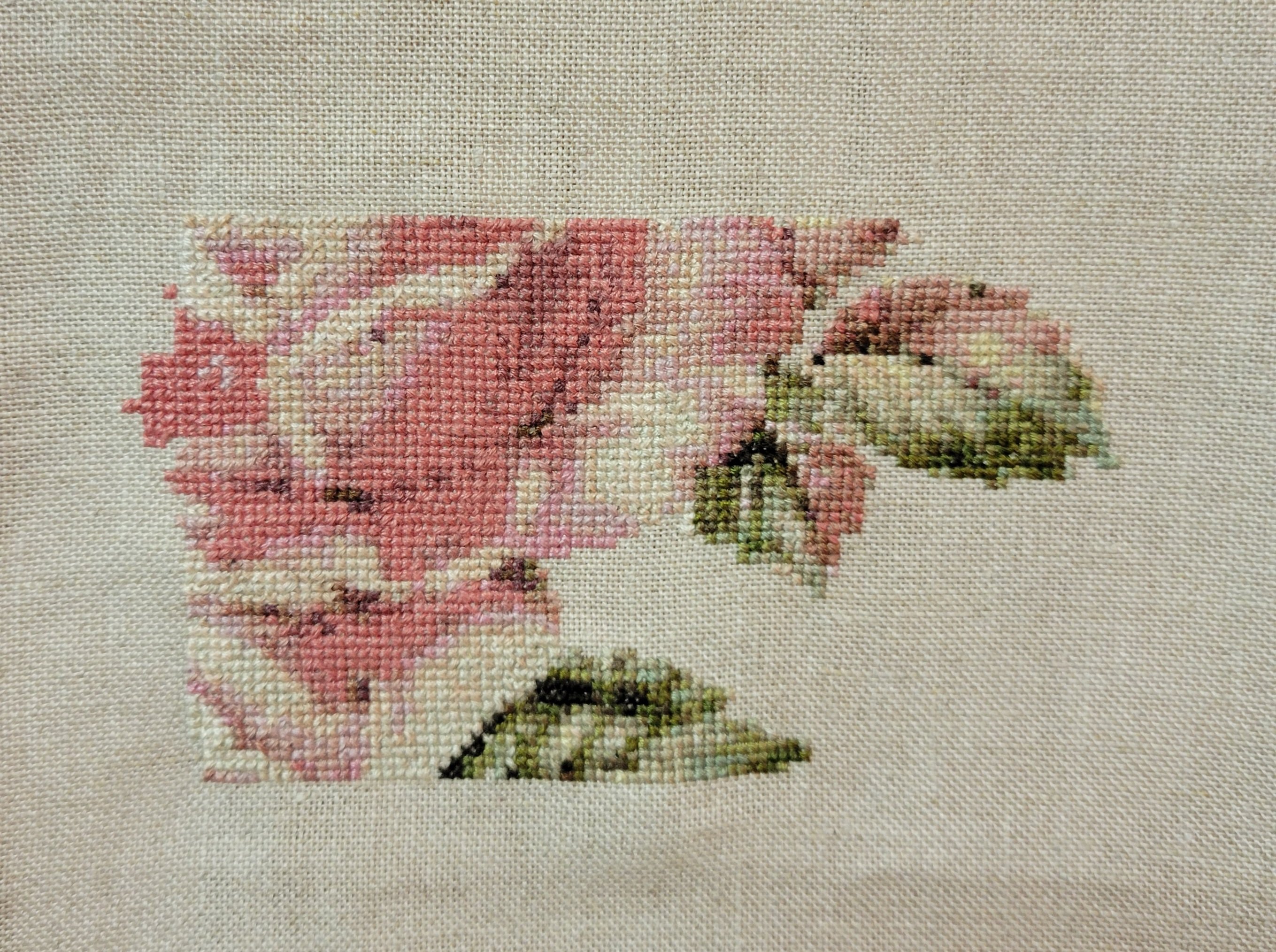 I am stitching on 32 ct beige linen which I have already had to frog a couple of times because if I am off a half a stitch it throws everything off…sigh.