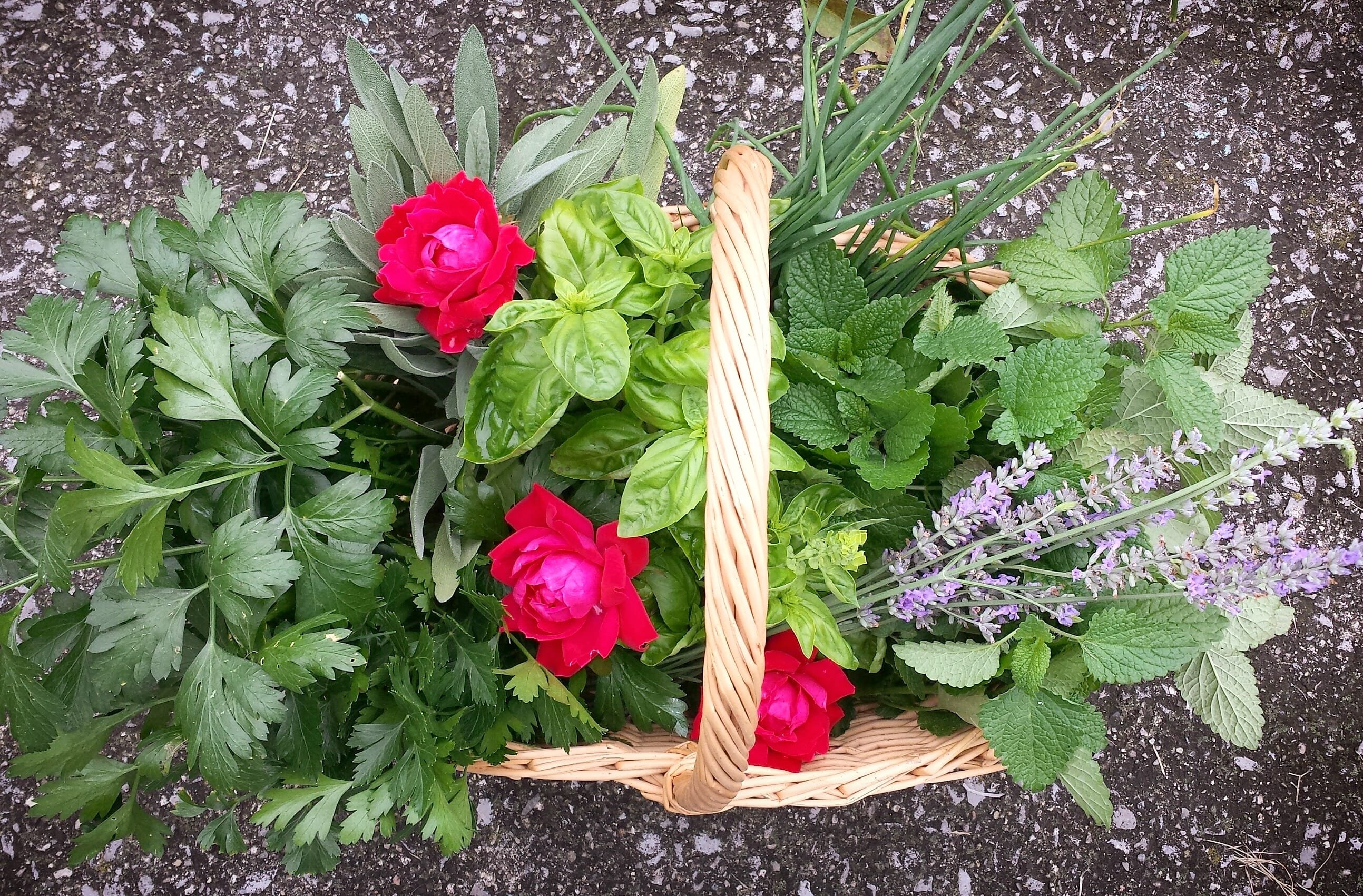 This bouquet consists of sage, rose, peppermint, basil, and lavender, all completely edible.Basket full of herbs for bouquets