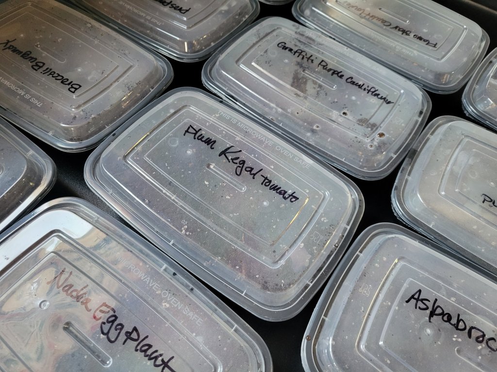I started plum tomatoes, regular tomatoes, purple and green basil, purple and green sprouting broccoli, purple and orange cauliflower, jalapenos, Lunchbox peppers, bell peppers and eggplant. I used the black bottomed/clear lidded takeout containers I had on hand. They were brand new but I didn’t like them for freezing meals in so I thought I would use them for starting my plants.