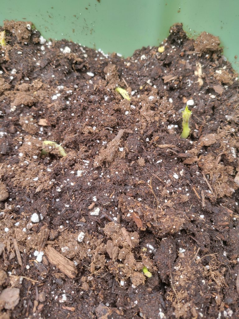 - The bin of potatoes is doing OK. I brought it in a few times because of the cold temperatures but I forgot one night so all the sprouting ends that were up are now toast, but there are more coming!