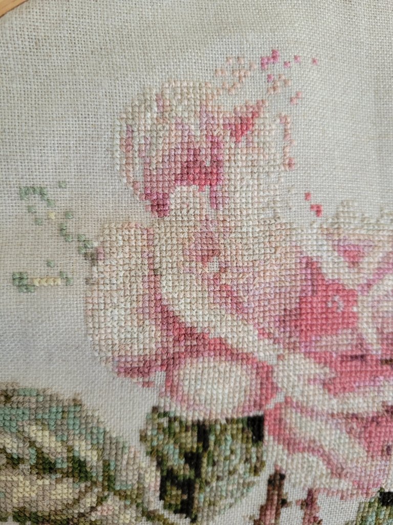 I made good progress on the upper half and even got a few stitches done on the last two rose buds for the bottom