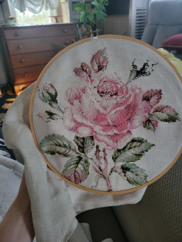 Most of my stitches were concentrated on the top bud but I also finished the top two leaves and worked some on the center.