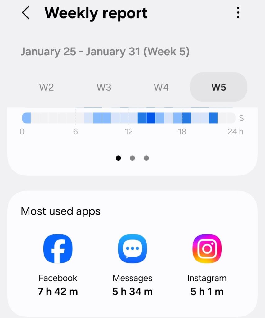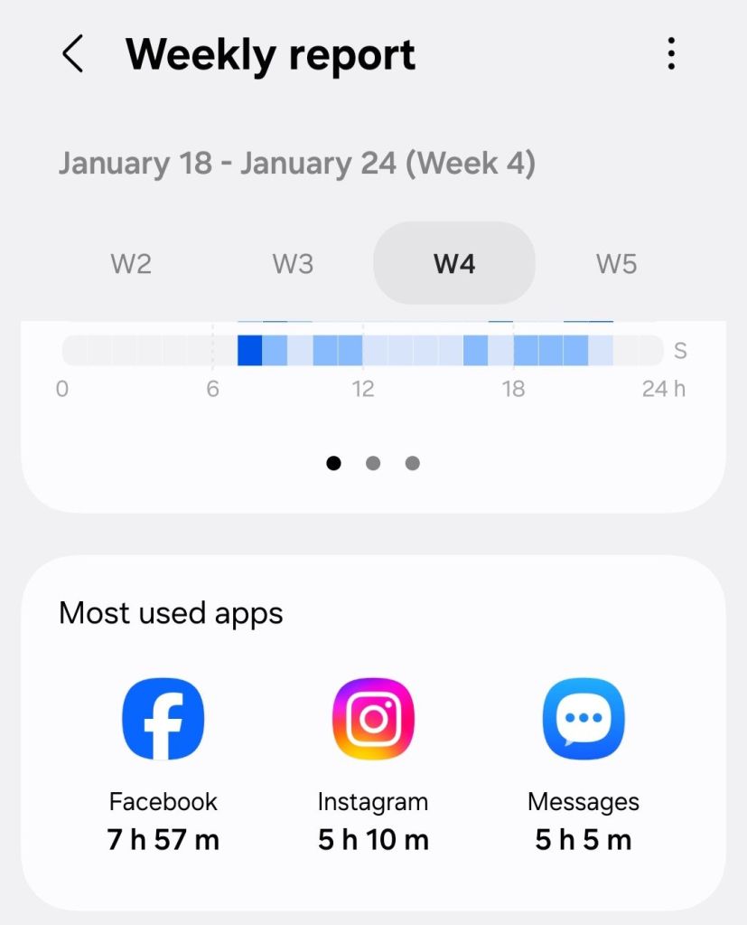 One of my goals with this is to have less screen time for social media and games. Since week 3, I have had less screen time with games, thankfully, but Facebook is still a problem. I don’t mind Instagram as much because most of my business dealings are on Instagram, and to be honest, I feel Instagram is less toxic. That’s just my opinion.