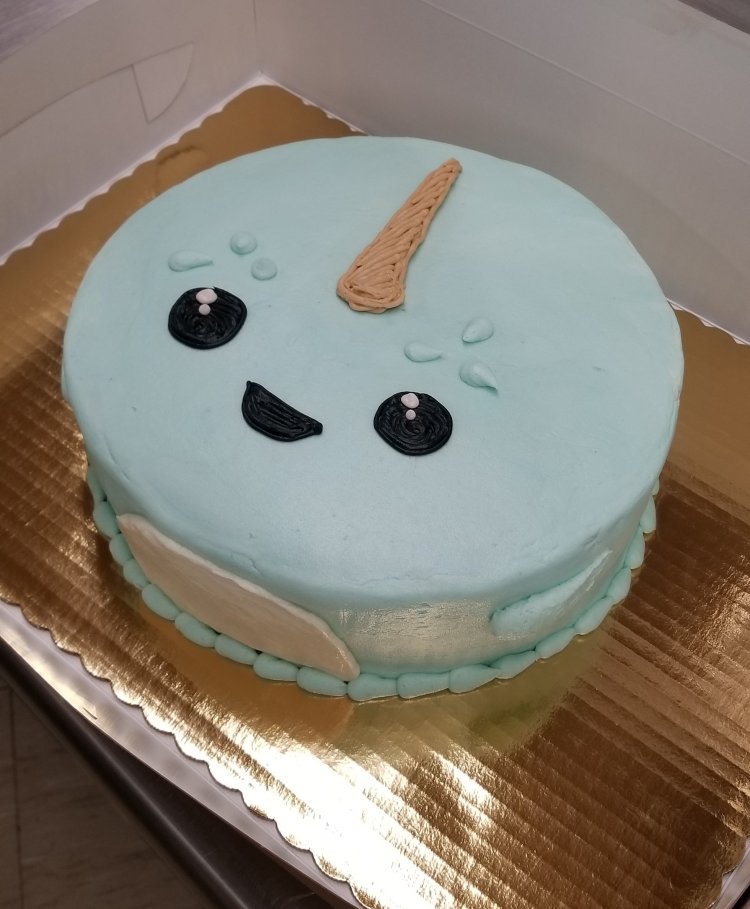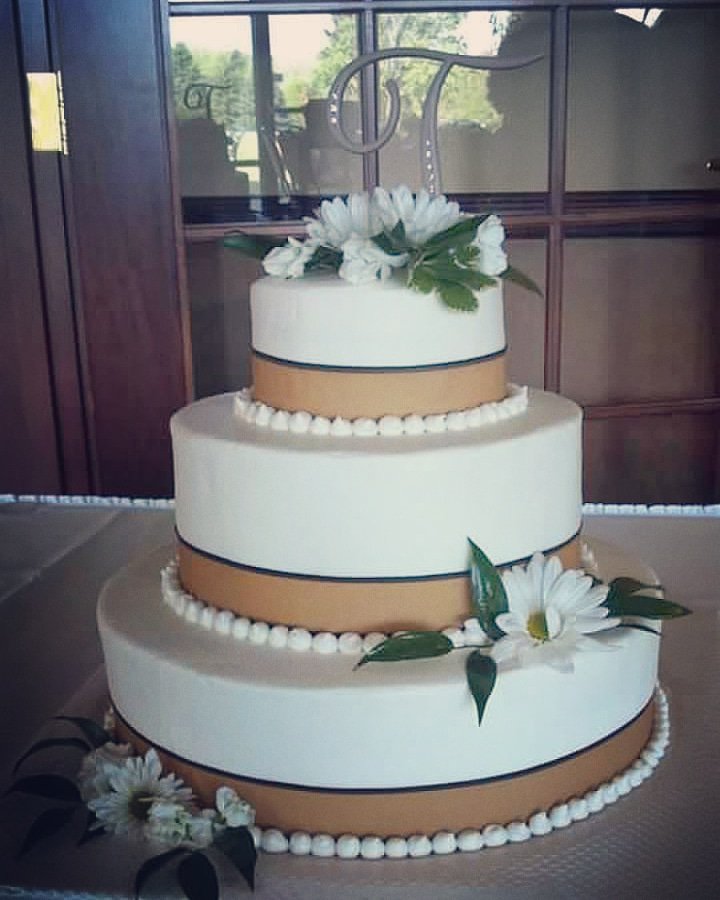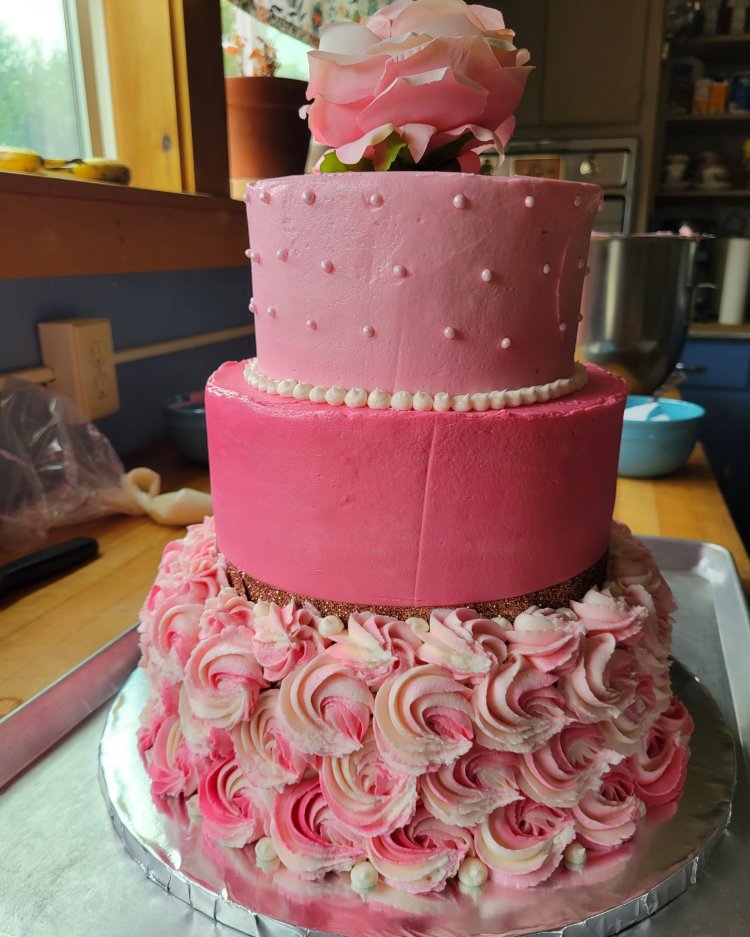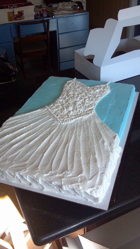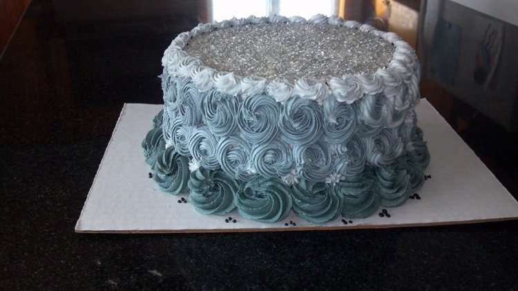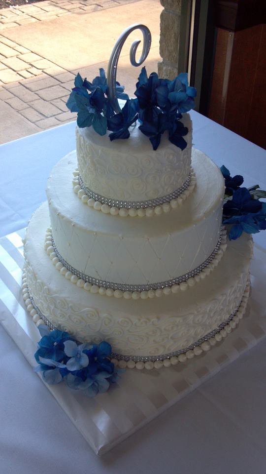This pretty little wedding cake is a double layer 6″ baby cake atop a single layer 10″ cake. The entire cake is frosted in little blue/gray buttercream. The lace is real lace cut to fit and the beading is believe it or not all buttercream. The flowers are gum paste which I purchased and hand painted myself to be a light pink. The Bride provided the figurines on top.