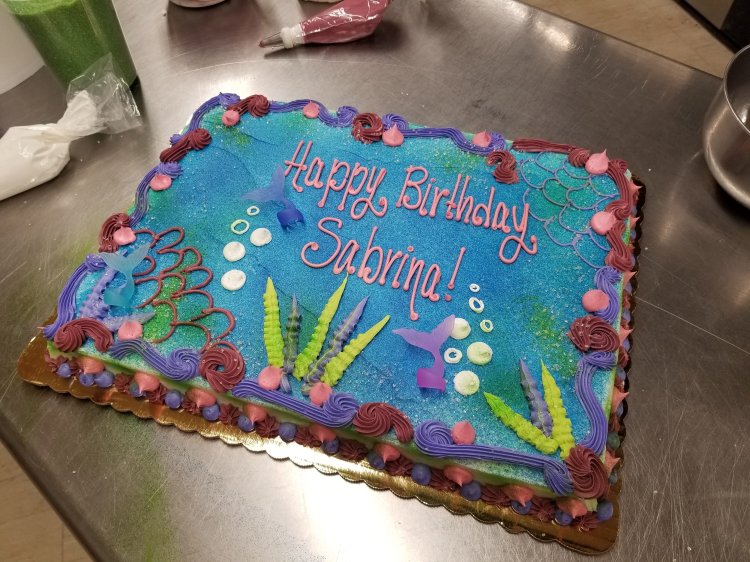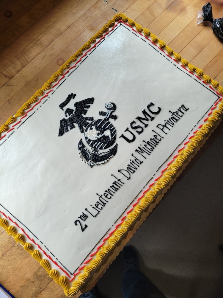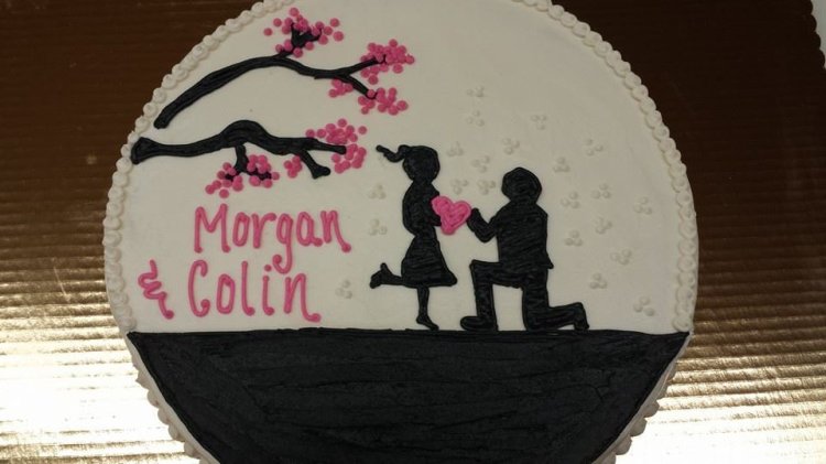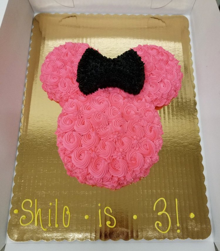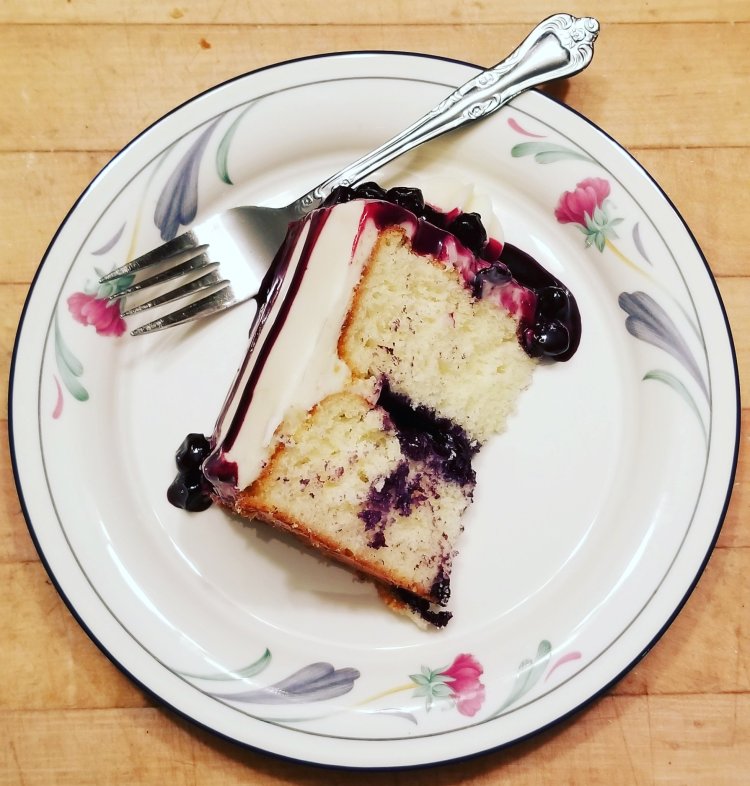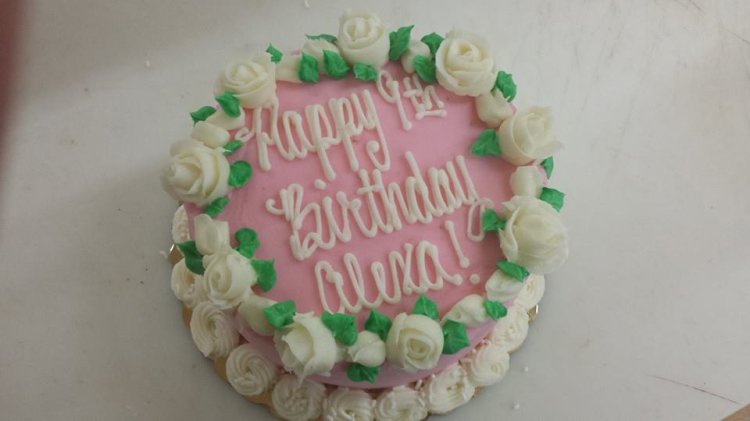 This pretty little wedding cake is a double layer 6″ baby cake atop a single layer 10″ cake. The entire cake is frosted in little blue/gray buttercream. The lace is real lace cut to fit and the beading is believe it or not all buttercream. The flowers are gum paste which I purchased and hand painted myself to be a light pink. The Bride provided the figurines on top.