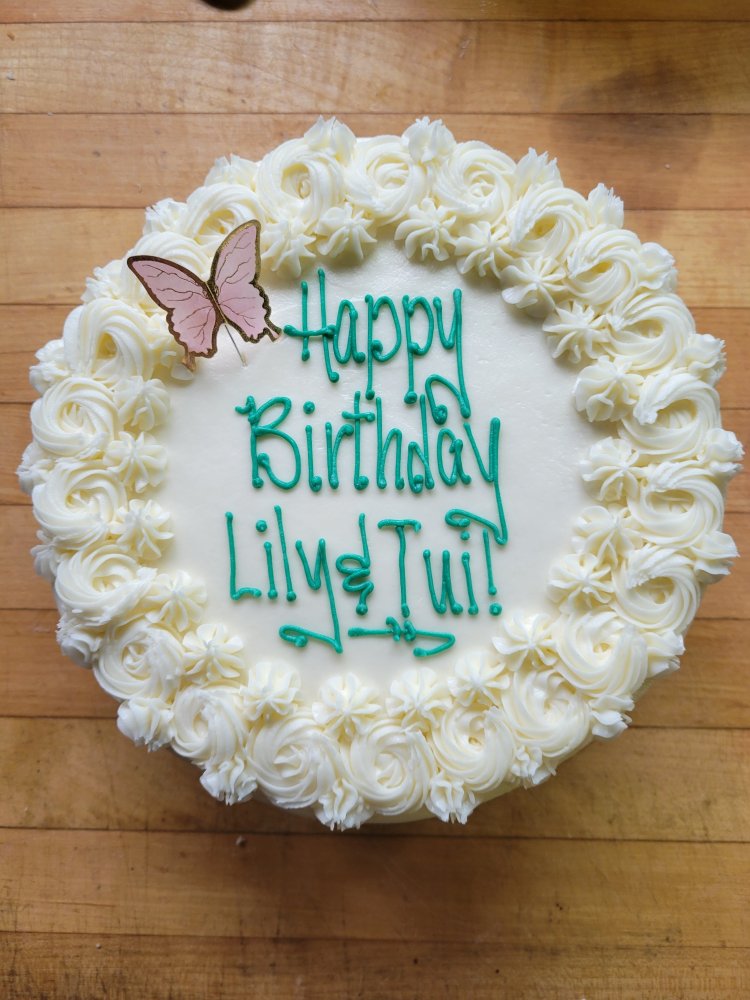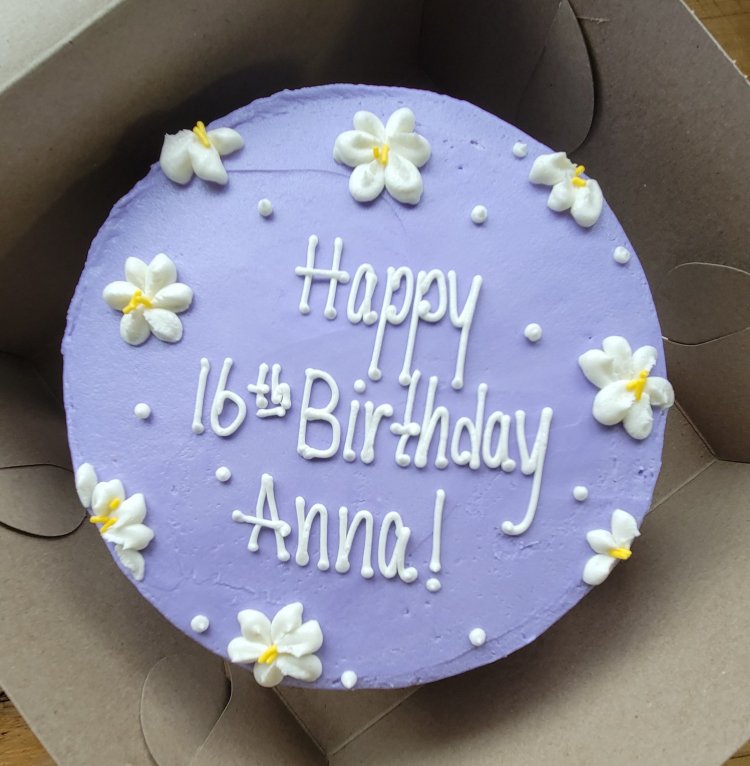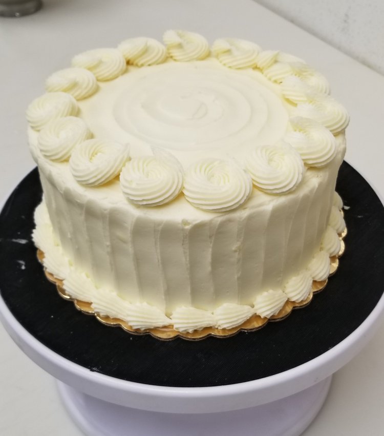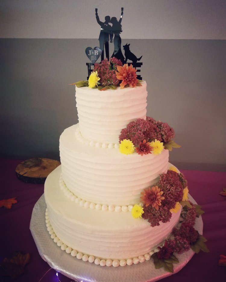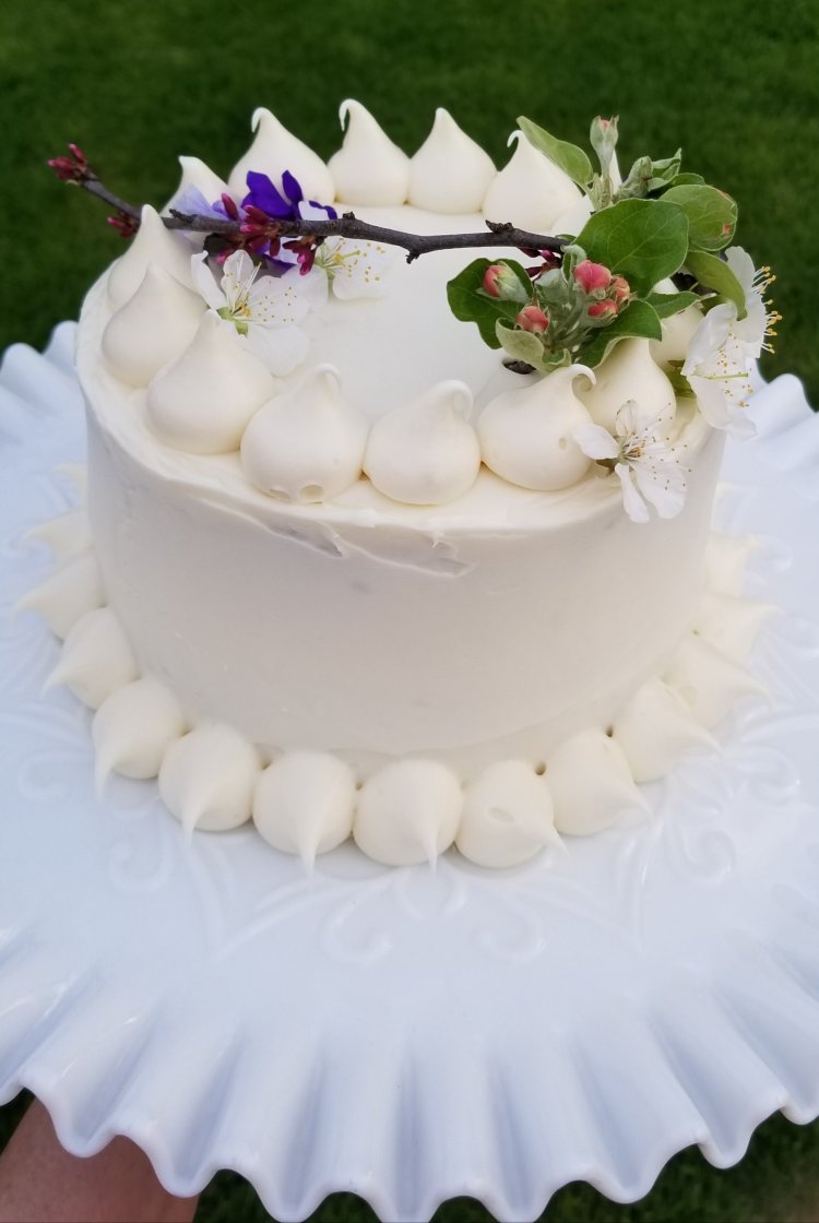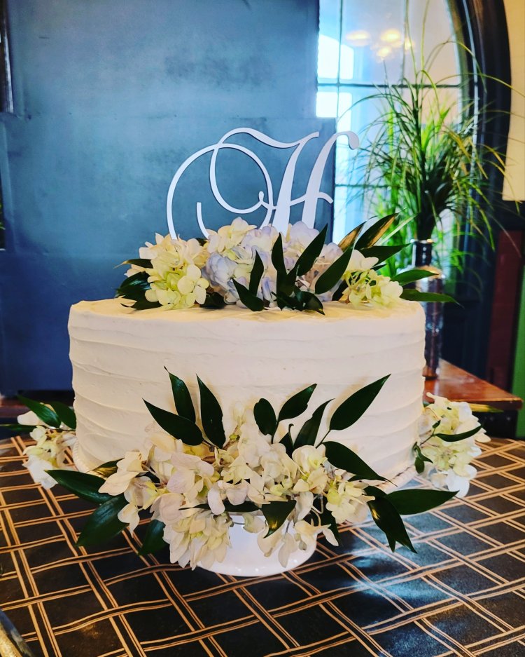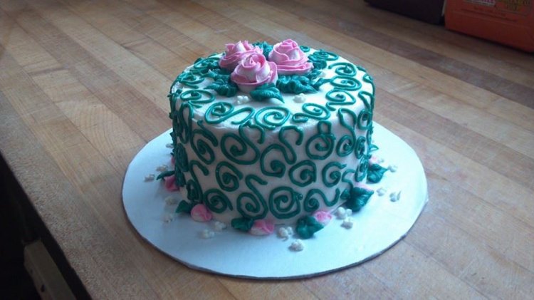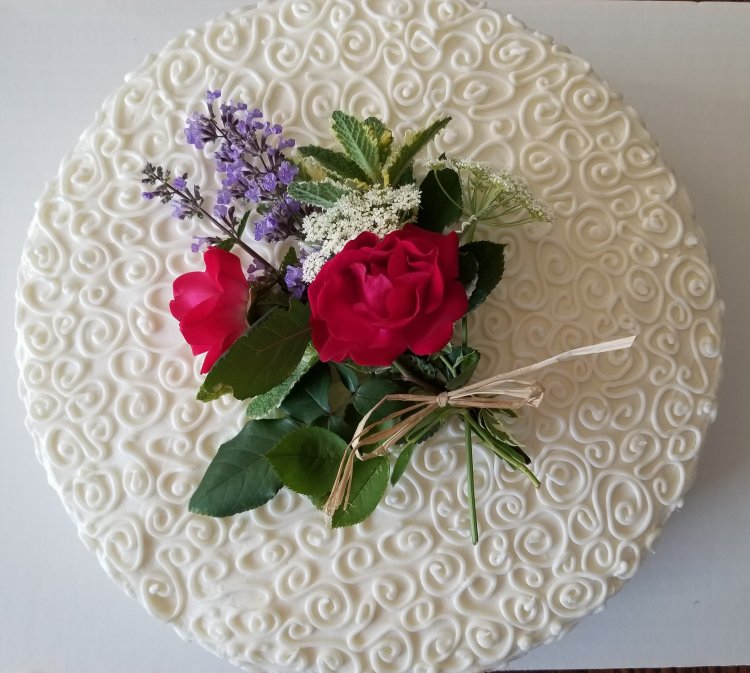 Anniversary cake with fresh flowers freehand scroll lace work of buttercream frosting