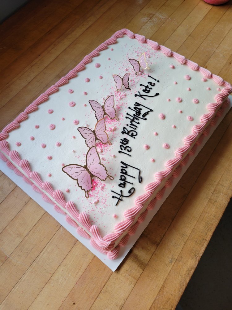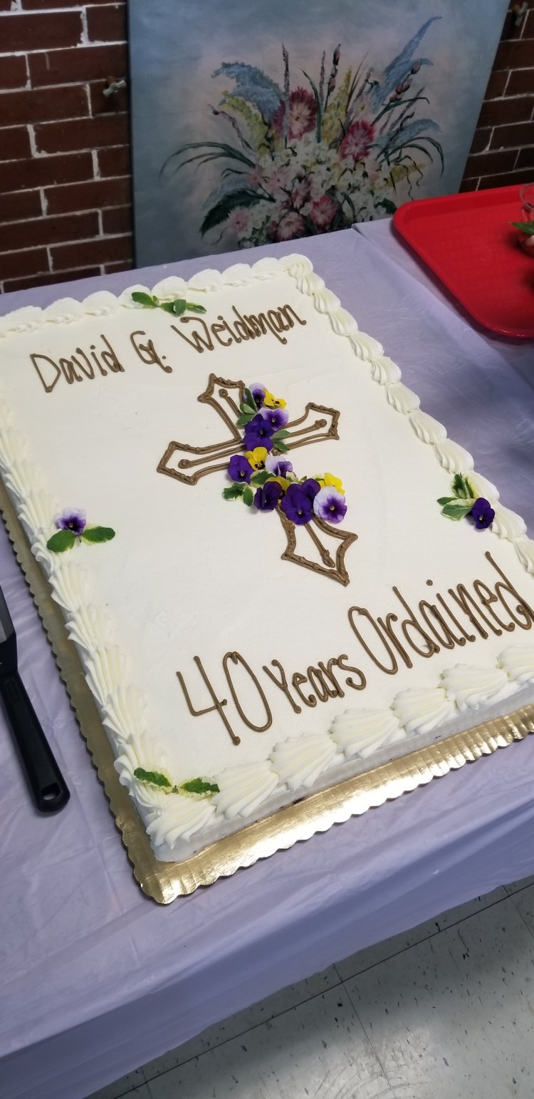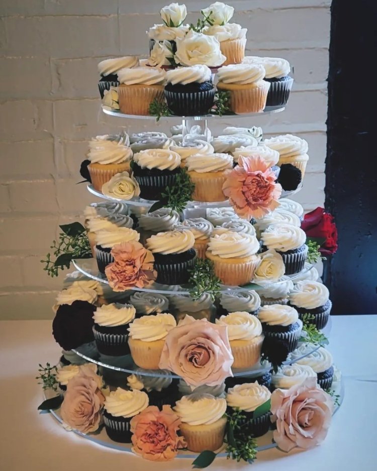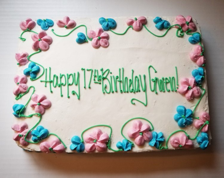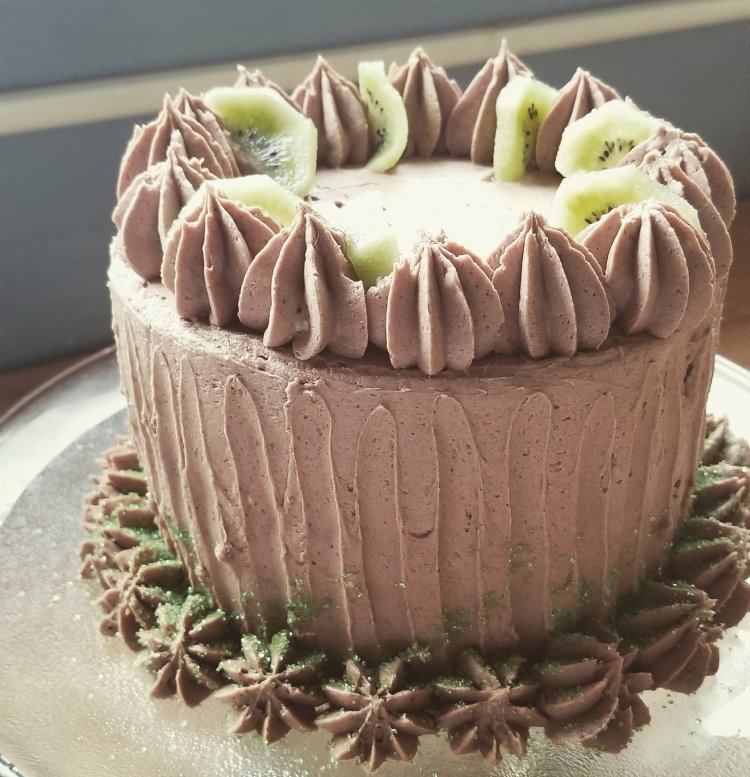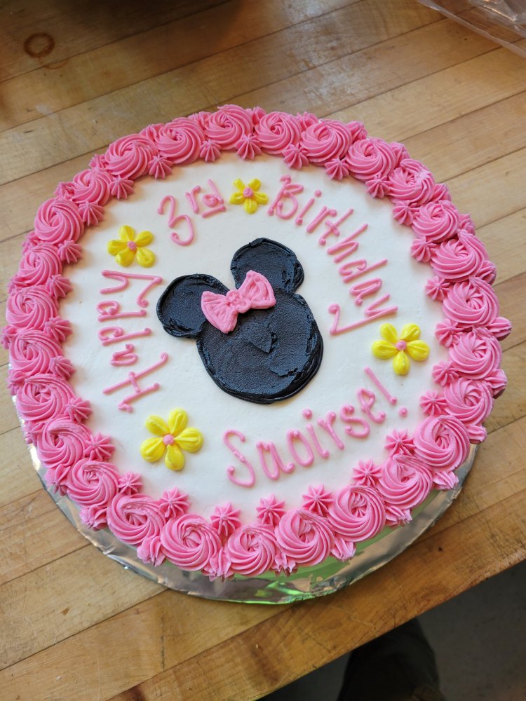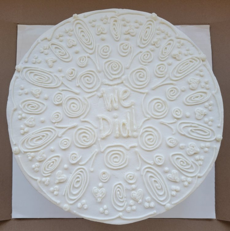 Anniversary cake with fresh flowers freehand scroll lace work of buttercream frosting
