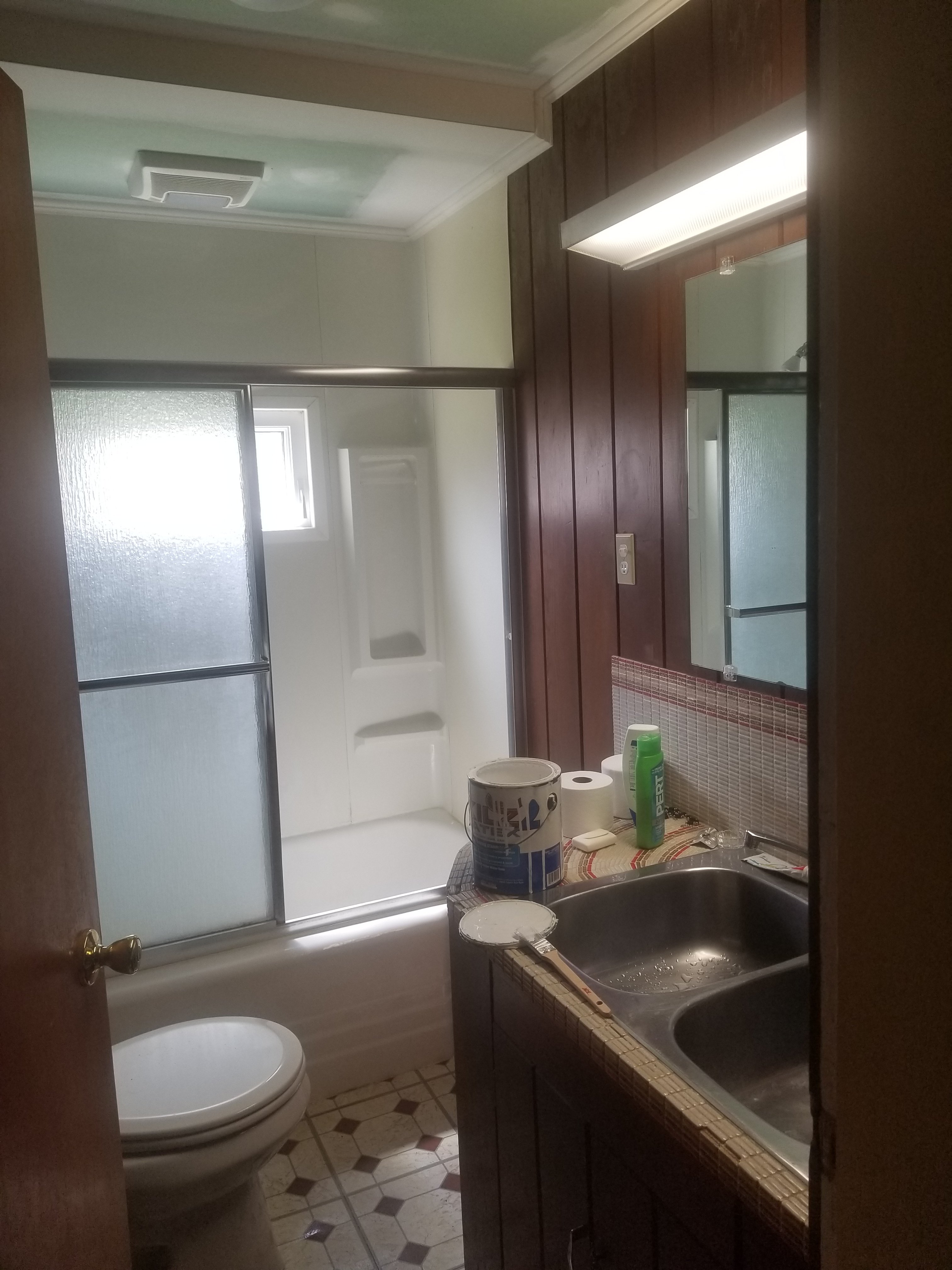 I have been wanting to paint our bathroom ever since we moved in. The room was lacking a ceiling exhaust fan which wasn’t an issue when this was my grandmother’s home because she didn’t take 20 minute steaming hot showers three times a day. But with the three of us living here it quickly warped the ceiling and caused mold and peeling paint. Yikes!