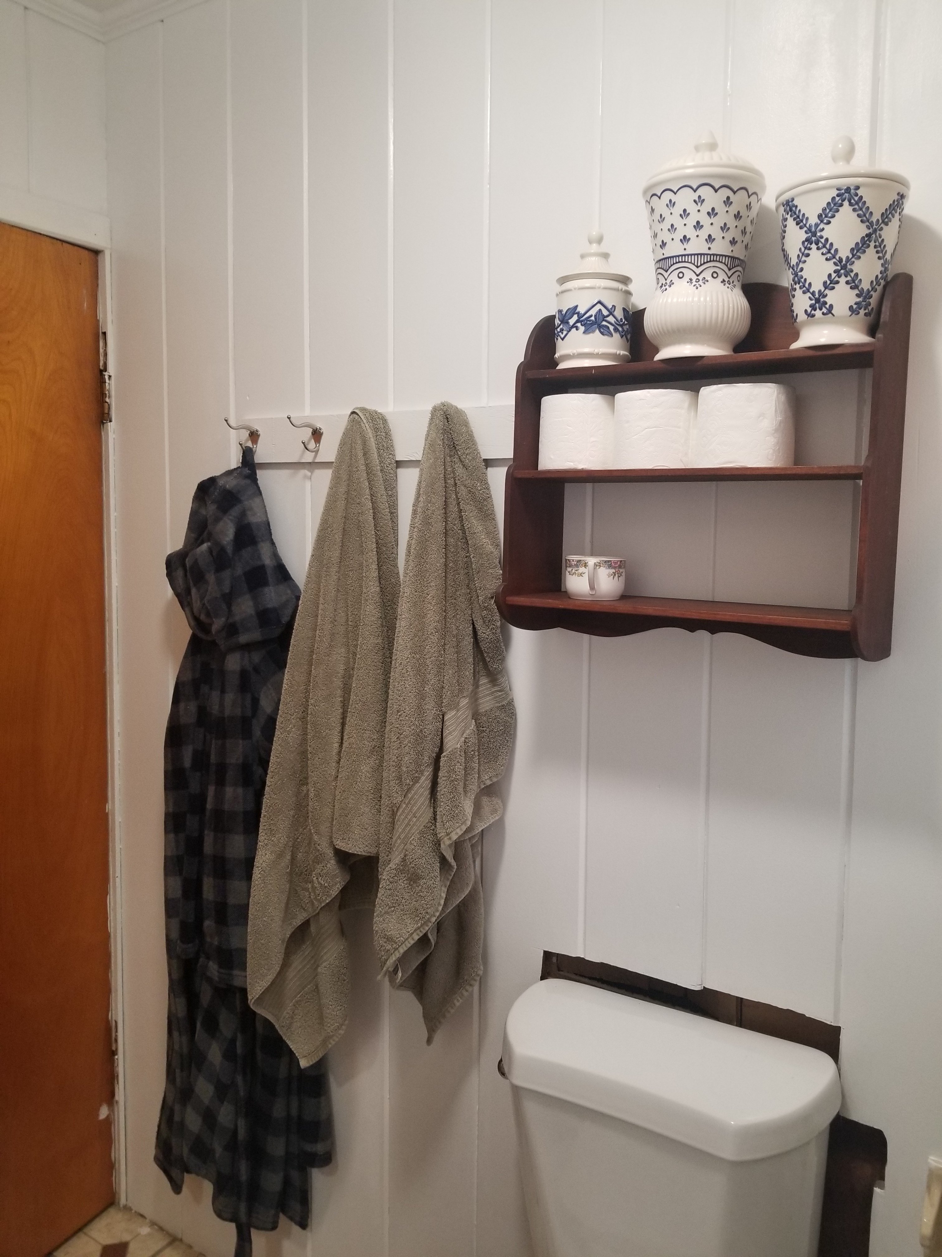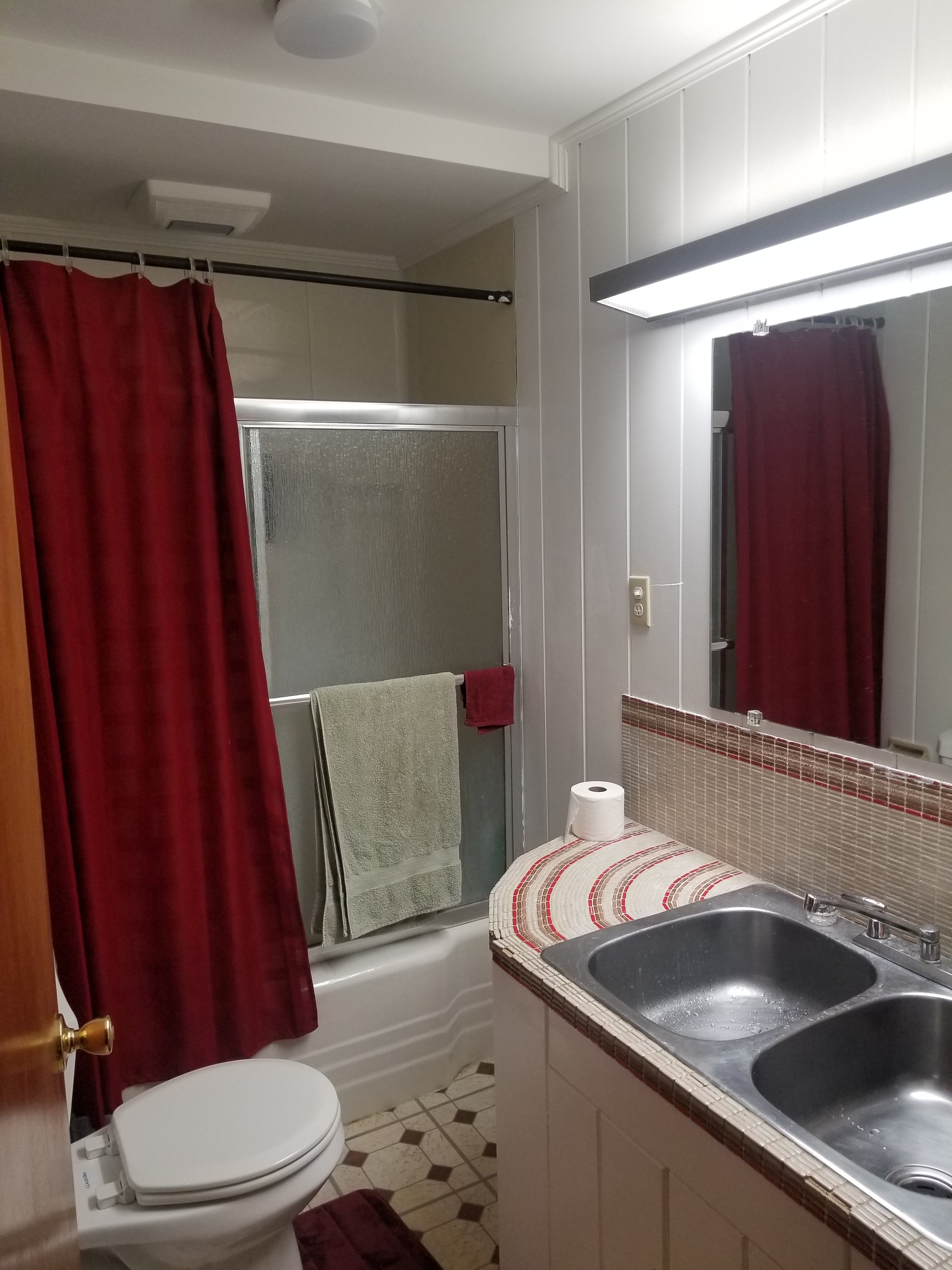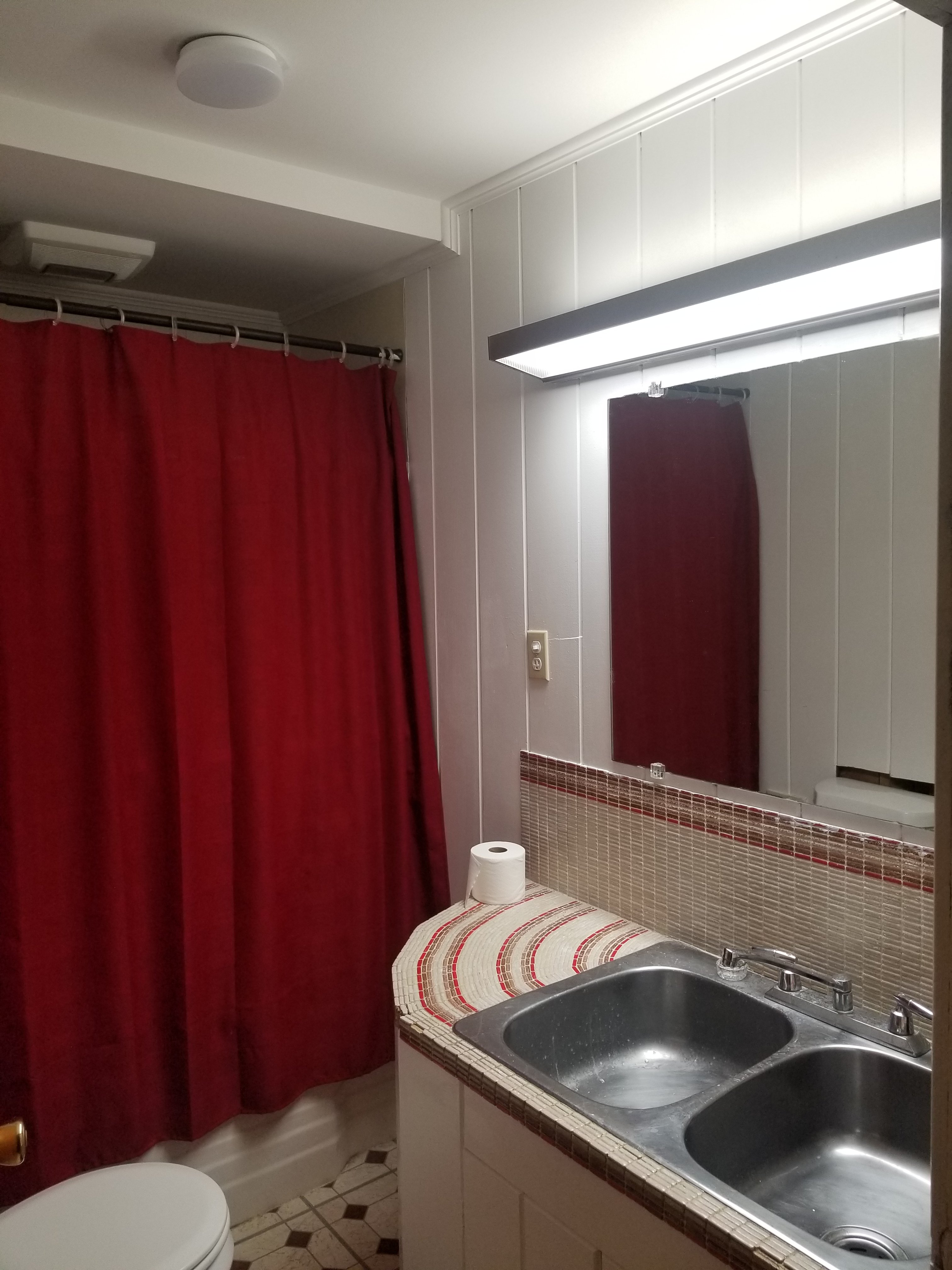 Now consider this a temporary fix until we can rip the whole bathroom out. Our tub is virtually uncleanble, having to use an industrial cleaner just to get it relatively clean because the glaze on the porcelain is shot. (No I don’t want to reglaze it) And that 1960s tiny tile on the vanity is not a color that goes with anything in my style book and don’t get me started on the floor but those things are tolerable now because WOW does the room look so much cleaner and brighter!