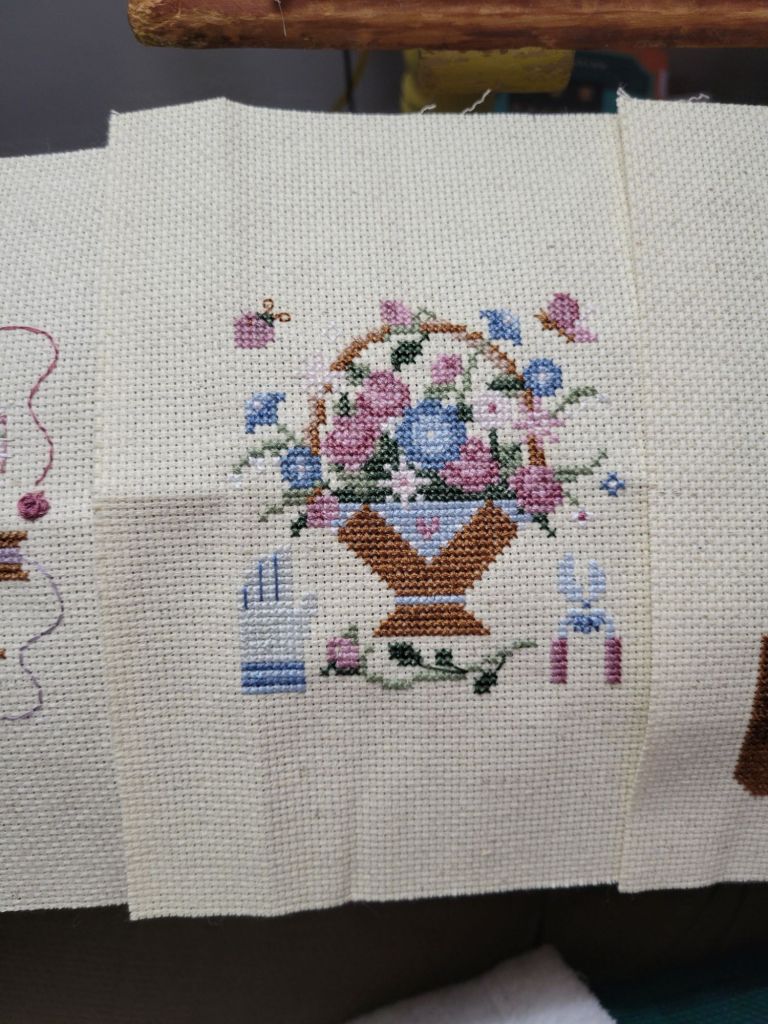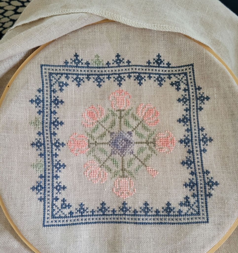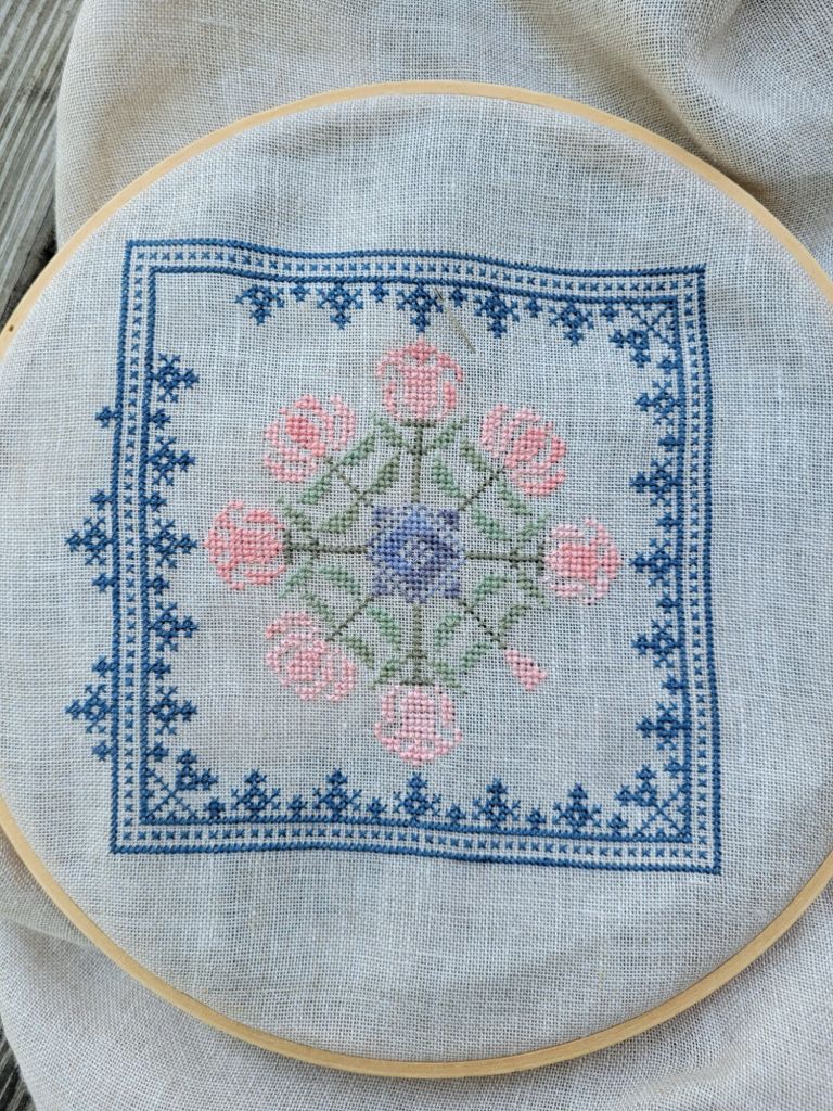 GOAL #3 Sewing projects – Finish Joyce’s Rose, New curtains for kitchen window, new seat cover for kitchen chair, new curtain over cat’s window seat, Christmas tree skirt, finish winter and summer season x-stitch projects