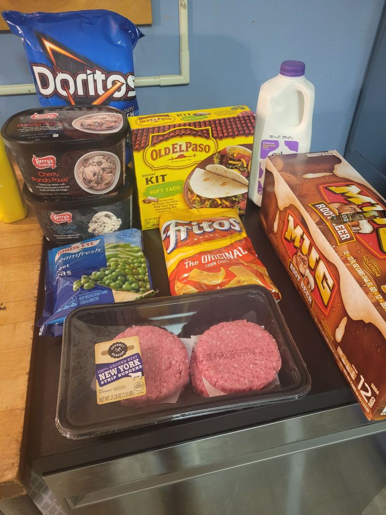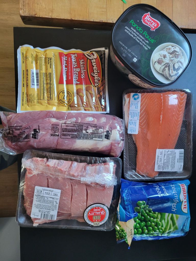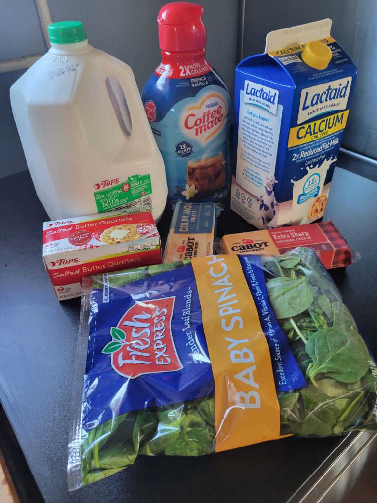 I grocery shopped for this week on Sunday after church and spent $112.20. I had to buy a lot of expensive, once in a while items like A-1 steak sauce and Red Hot this week plus the coffee and Sahlen’s deli ham were each over $10. I didn’t get a pic of the butter, sour cream or can of whipped cream I bought but the rest is pictured below.